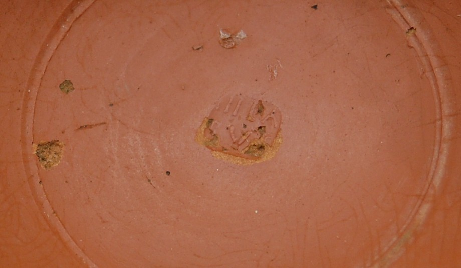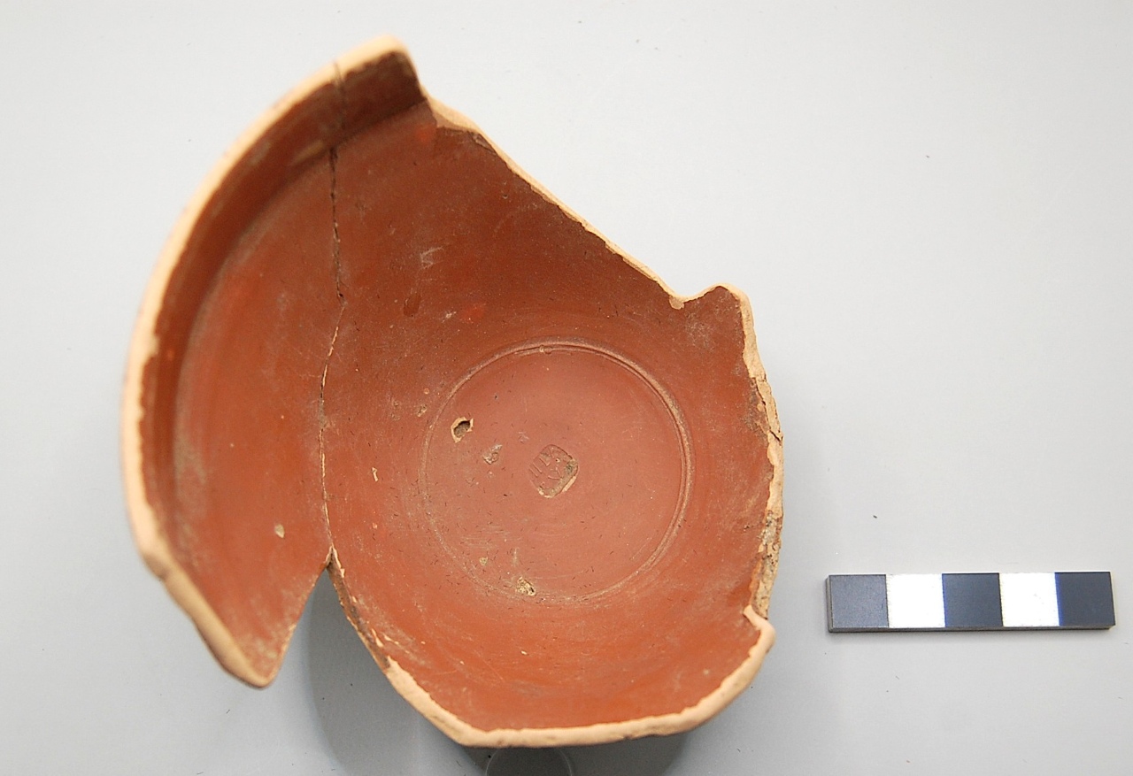 Alto bordo diritto con orlo arrotondato; vasca a pareti troncoconiche con carena accentuata; piede ad anello; sul fondo interno bollo entro cartiglio rettangolare