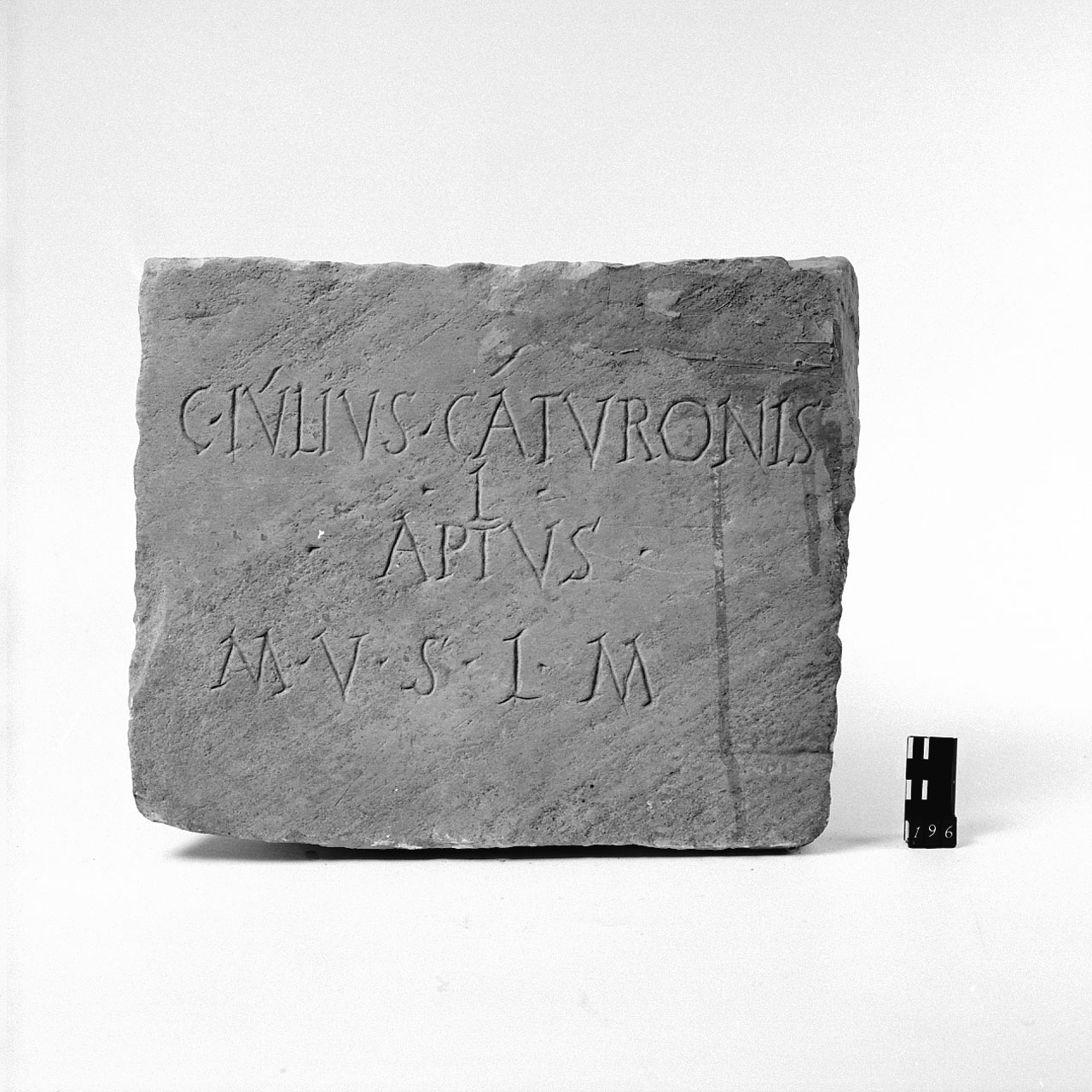 - ISCRIZIONI Ben centrata rispetto ai margini - C(aius) * IVLIVS * CATVRONIS / * L(ibertus) * / *APTVS * / M(atronis) * - capitale - INCISIONE - latino
