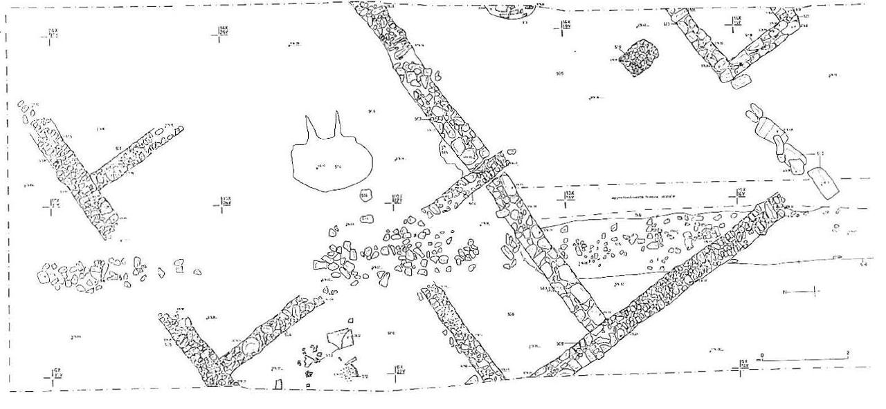 Durante lavori per l'acquedotto si rinvengono i resti di un insediamento rurale di età romana, orientato NE/SW. E’ stato riconosciuto un vasto ambiente rettangolare porticato (mq. 45 circa) collegato ad altri ambienti annessi, di dimensioni minori, tra cui una cucina (m. 4,70x4,20), ipotizzata per la presenza di un livello antropico bruno limoso con carboni e rari frammenti ceramici. Sul lato lungo a SE, l’ambiente porticato è provvisto di una soglia in lastre di arenaria poste di piatto, che collega ad un ambiente quadrangolare (m. 1,60x1,60) a W. Le strutture, individuate immediatamente al di sotto del piano di coltivo, sono conservate solo in fondazione, costituita da blocchetti di arenaria privi di legante. I crolli in laterizio riferibili soltanto alle coperture, portano ad ipotizzare che l’elevato fosse realizzato con tecnica edilizia leggera e precaria, forse opus graticium. Gli scarsi materiali (terra sigillata sud-gallica e ceramica a pareti sottili; una lucerna con bollo CASSI) indicano un orizzonte cronologico tra il I e il II sec. d.C
