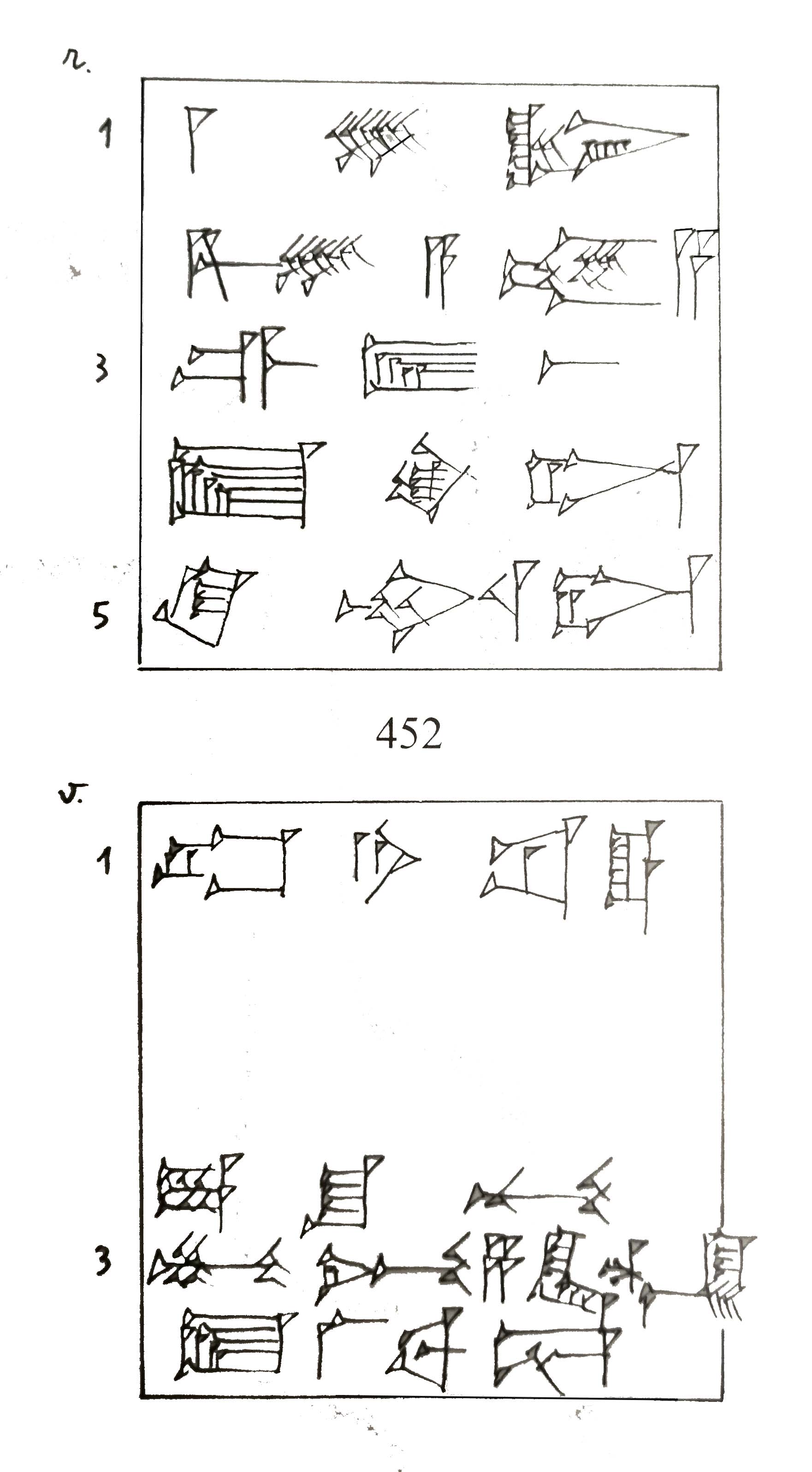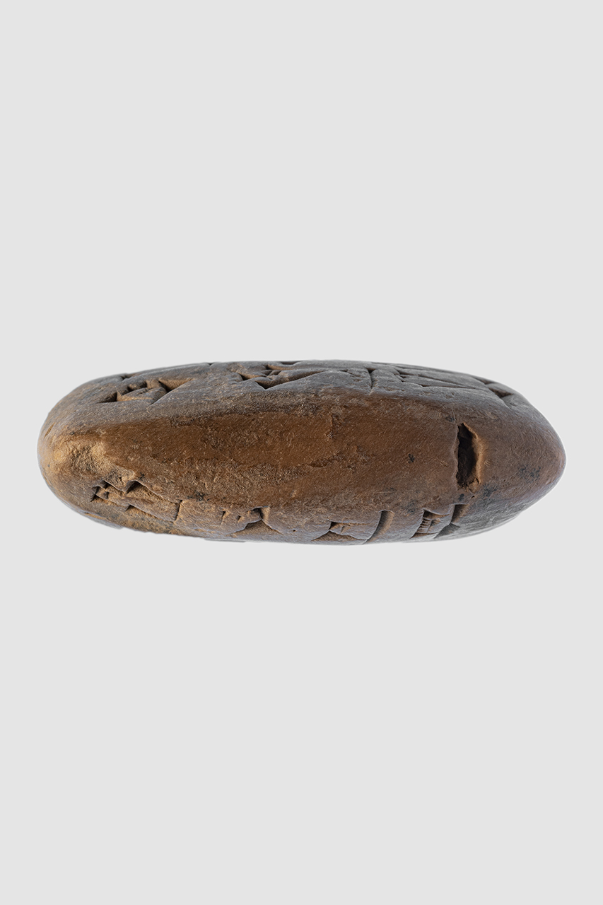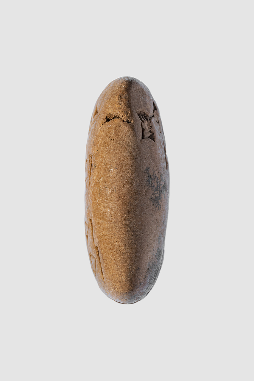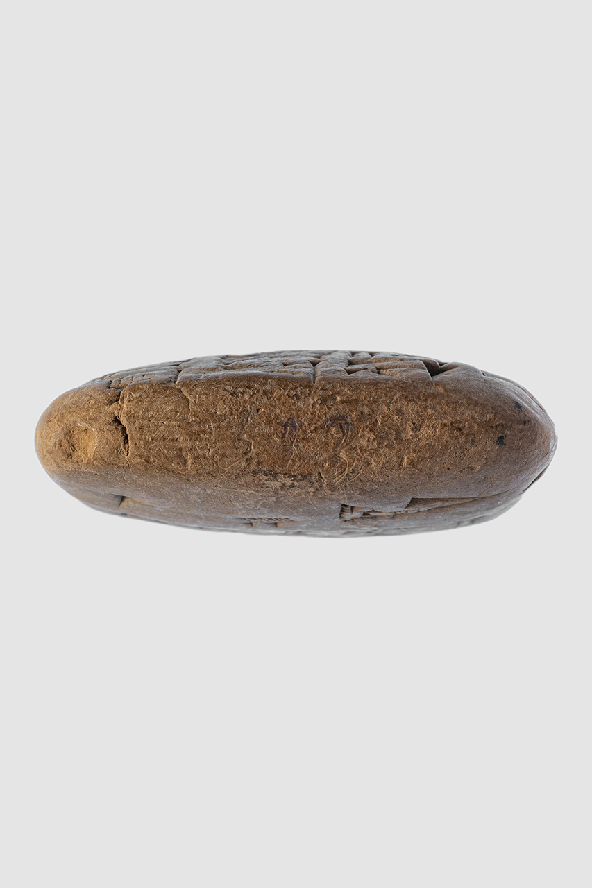 - ISCRIZIONI recto - 1. 1(barig) še lugal 2. gi-a sa10-a 3. mar-sa-aš 4. e2-kikken-ta 5. ki ARAD2-ta Traduzione: 60 sila di orzo secondo il gur “reale”, acquistato in cambio di canne per l’arsenale dal mulino. Da Ir - cuneiforme - sumerico