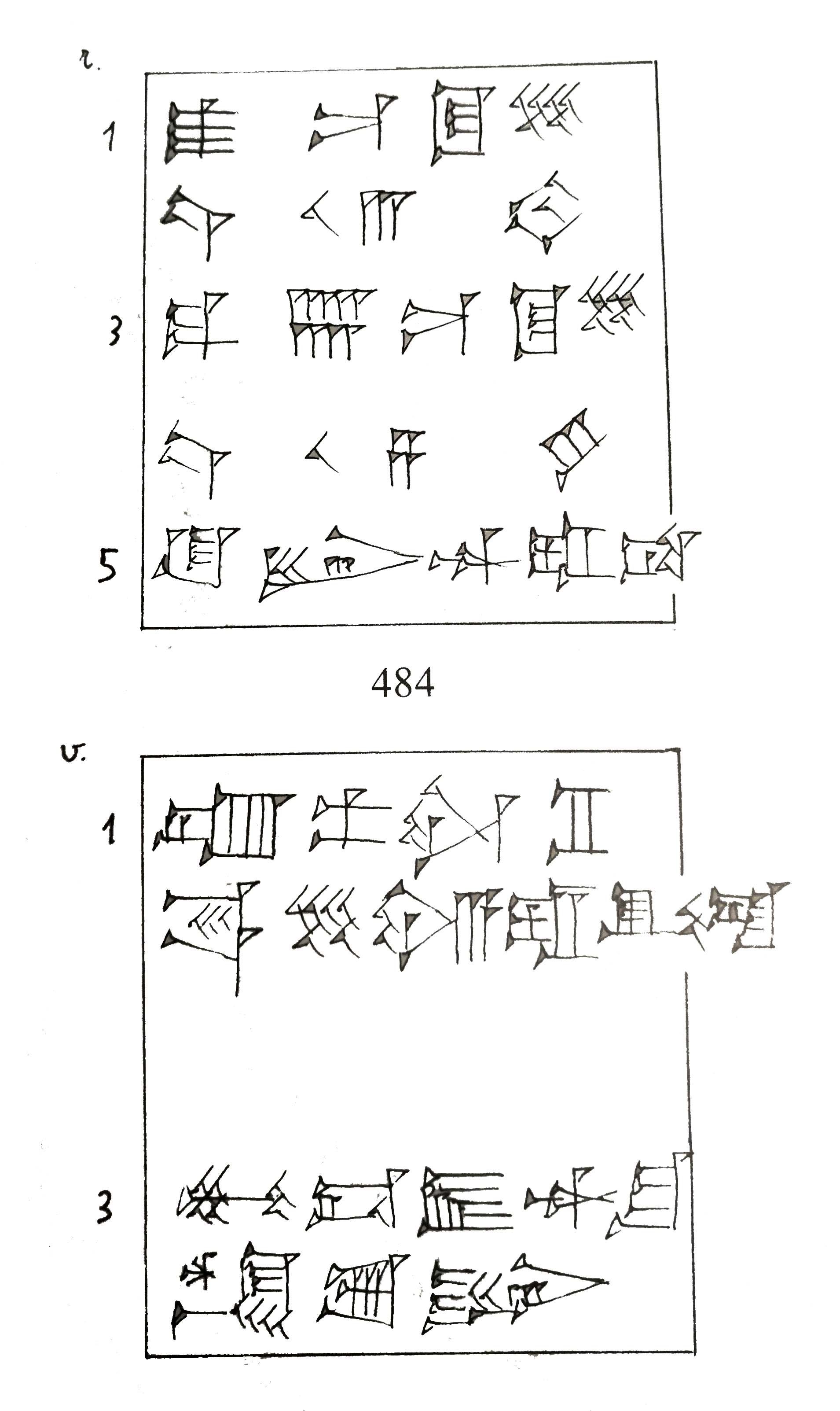 sila3 dabin 2. u4 10 + 3-kam 3. 3(ban2) 9 sila3 dabin 4. u4 10 + 4-kam 5. ki lu2-dingir-ra-ta Traduzione: 40 sila di farina di orzo: 13° giorno; 39 sila di farina d’orzo: 14° giorno. Da parte di Lu-dingira - cuneiforme - sumerico -