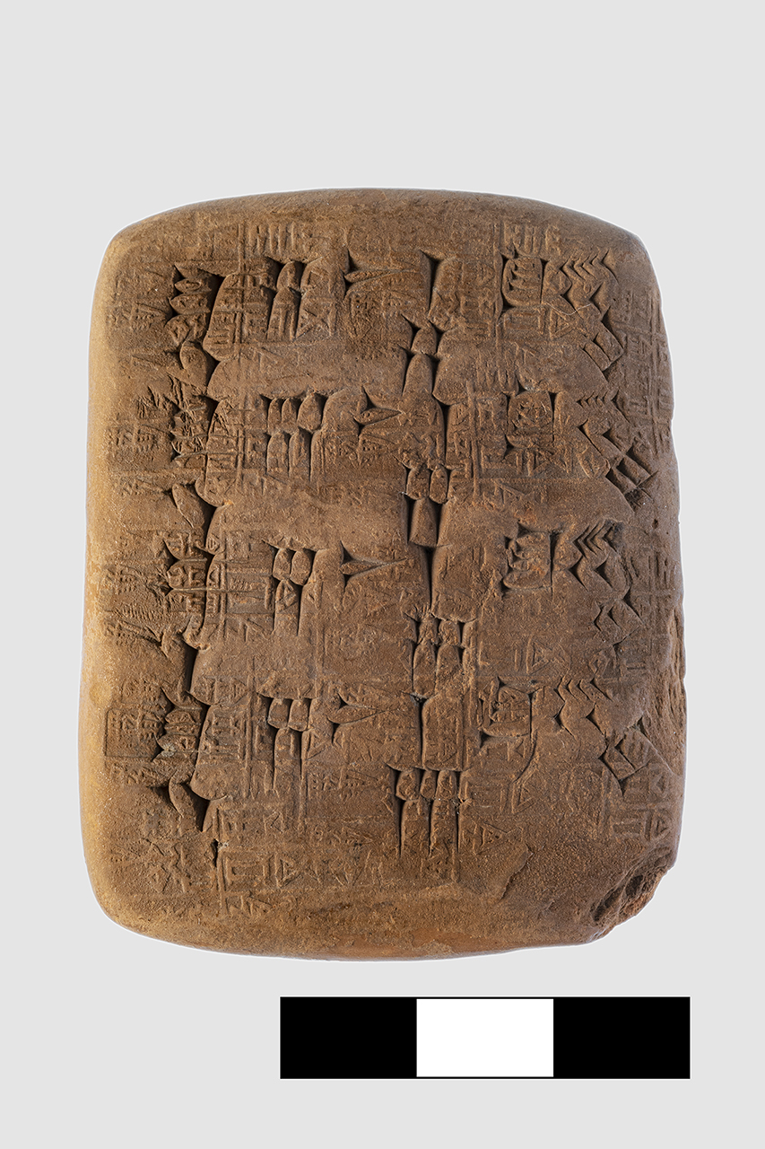 - NOTIZIE STORICO CRITICHE Il testo della tavoletta recita:"34 sila di farina di orzo: 4° giorno; 48 sila di farina d’orzo: 5° giorno; 25 sila di farina d’orzo: 6° giorno; 45 sila di farina d’orzo: 7° giorno; 28 sila di farina d’orzo: 8° giorno; 10 sila di farina fine, 20 sila di farina d’orzo: provvigioni di Ur-nigar. Da parte di Šara-kam. Sigillato dal governatore. Mese dei due santuari. Anno dopo quello in cui Simanum fu razziata." Sia sul recto che sul verso è presente un sigillo impresso più volte, la cui iscrizione recita: "Šu-Suen, re forte, re di Ur, re delle dei quattro angoli del mondo Aakalla, governatore di Umma, tuo servitore."