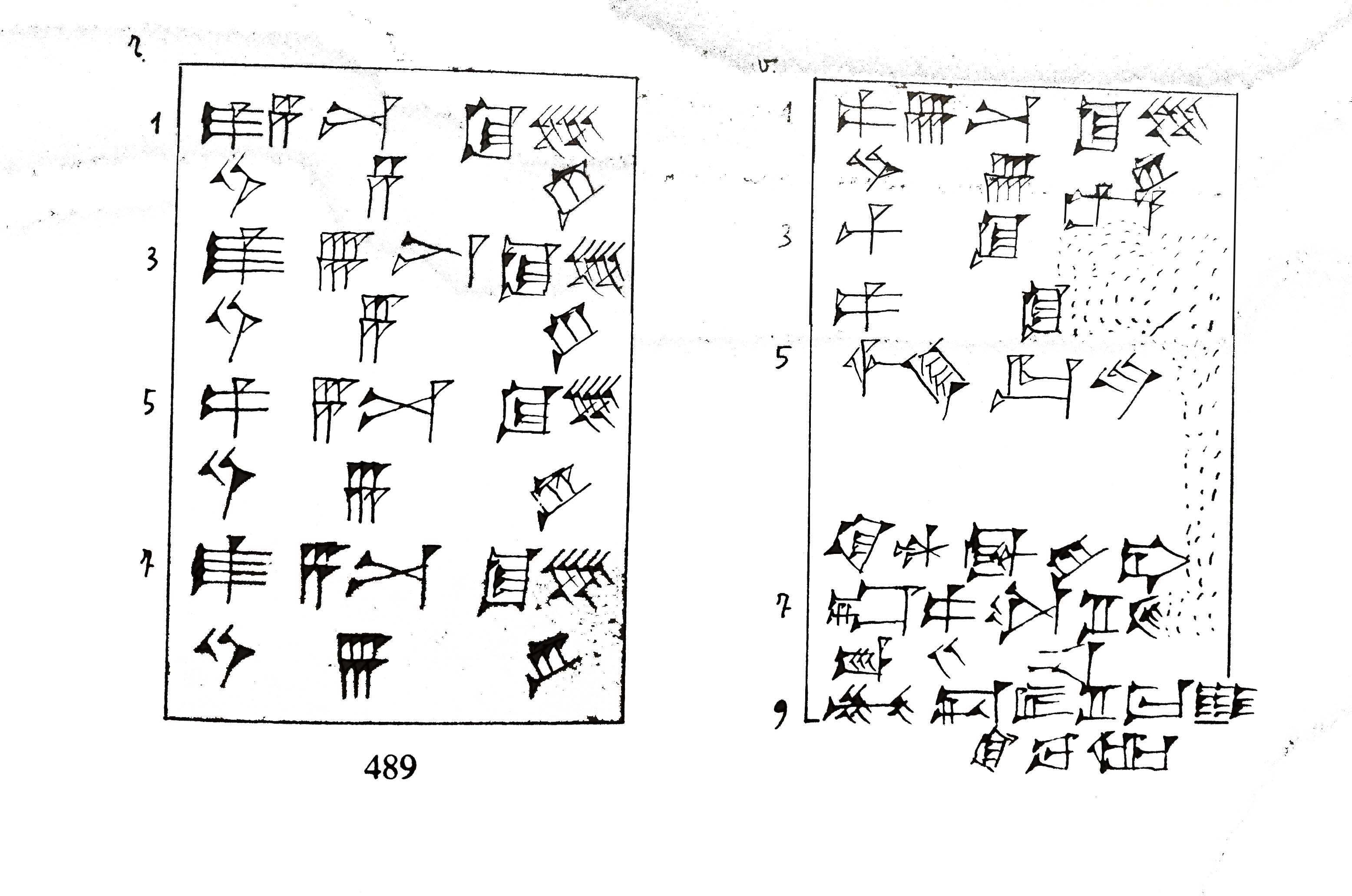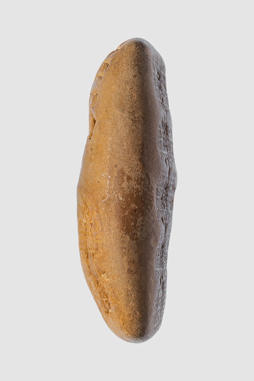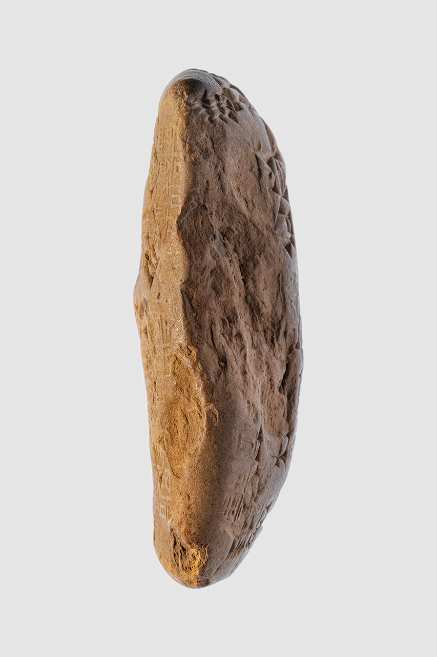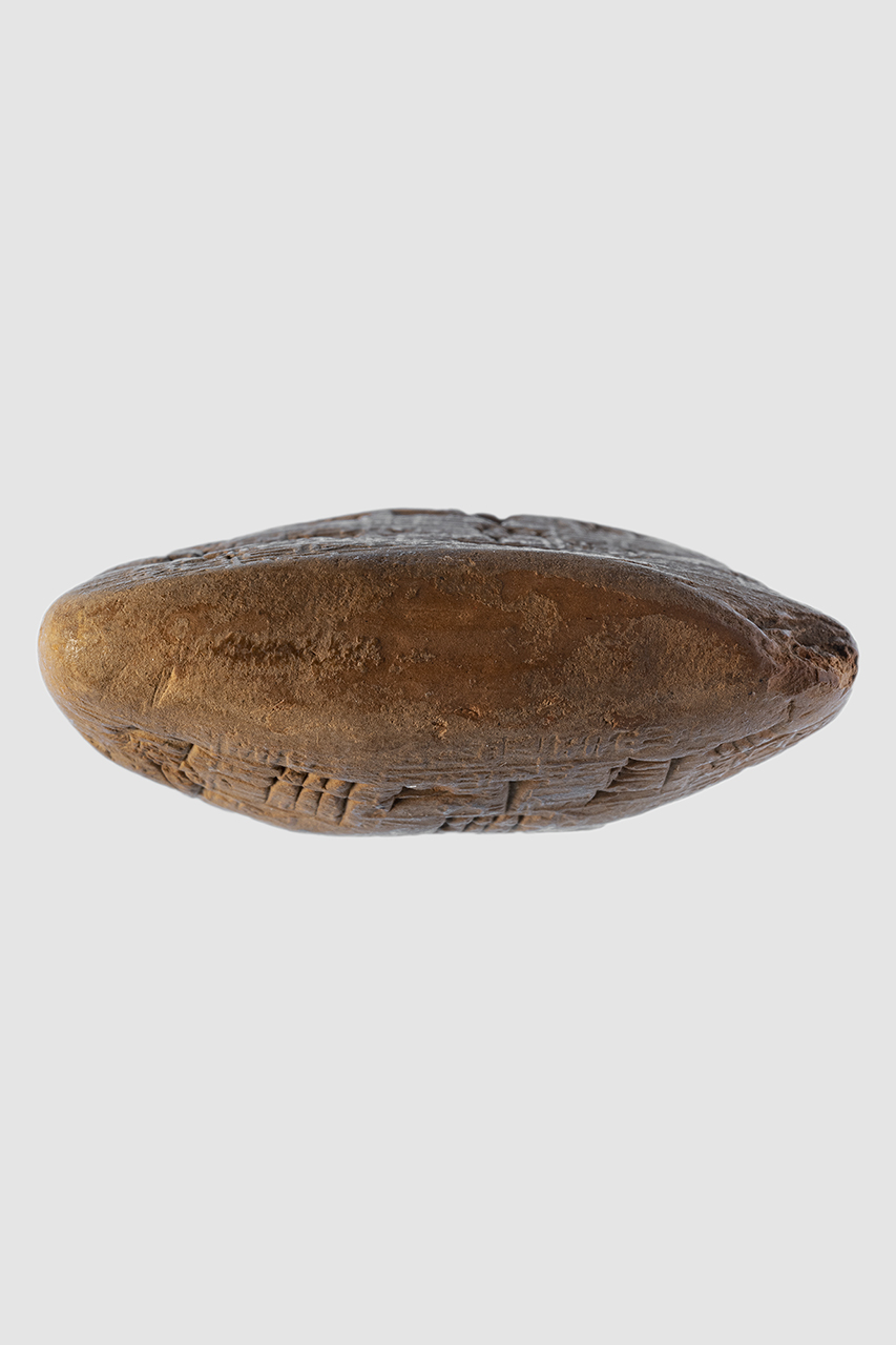 - ISCRIZIONI recto - 1. 3(ban2) 4 sila3 dabin 2. u4 4-kam 3. 4(ban2) 8 sila3 dabin 4. u4 5-kam 5. 2(ban2) 5 sila3 dabin 6. u4 6-kam 7. 4(ban2) 5 sila3 dabin 8. u4 7-kam Traduzione: 34 sila di farina di orzo: 4° giorno; 48 sila di farina d’orzo: 5° giorno; 25 sila di farina d’orzo: 6° giorno; 45 sila di farina d’orzo: 7° giorno - cuneiforme - sumerico