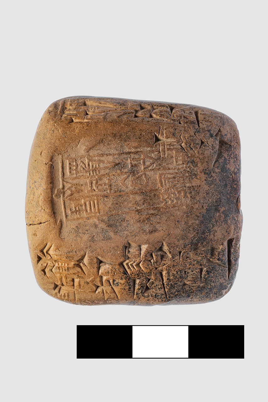 Tavoletta cuneiforme neosumerica in argilla di forma quadrangolare irregolare con angoli smussati, di contenuto amministrativo. Il colore è marrone chiaro con alcune parti annerite. La conservazione è buona e permette la lettura. L'iscrizione in lingua sumerica si sviluppa su quattro righe nel recto e su due nel verso. Sulla superficie è impresso inoltre un sigillo con iscrizione di tre righe