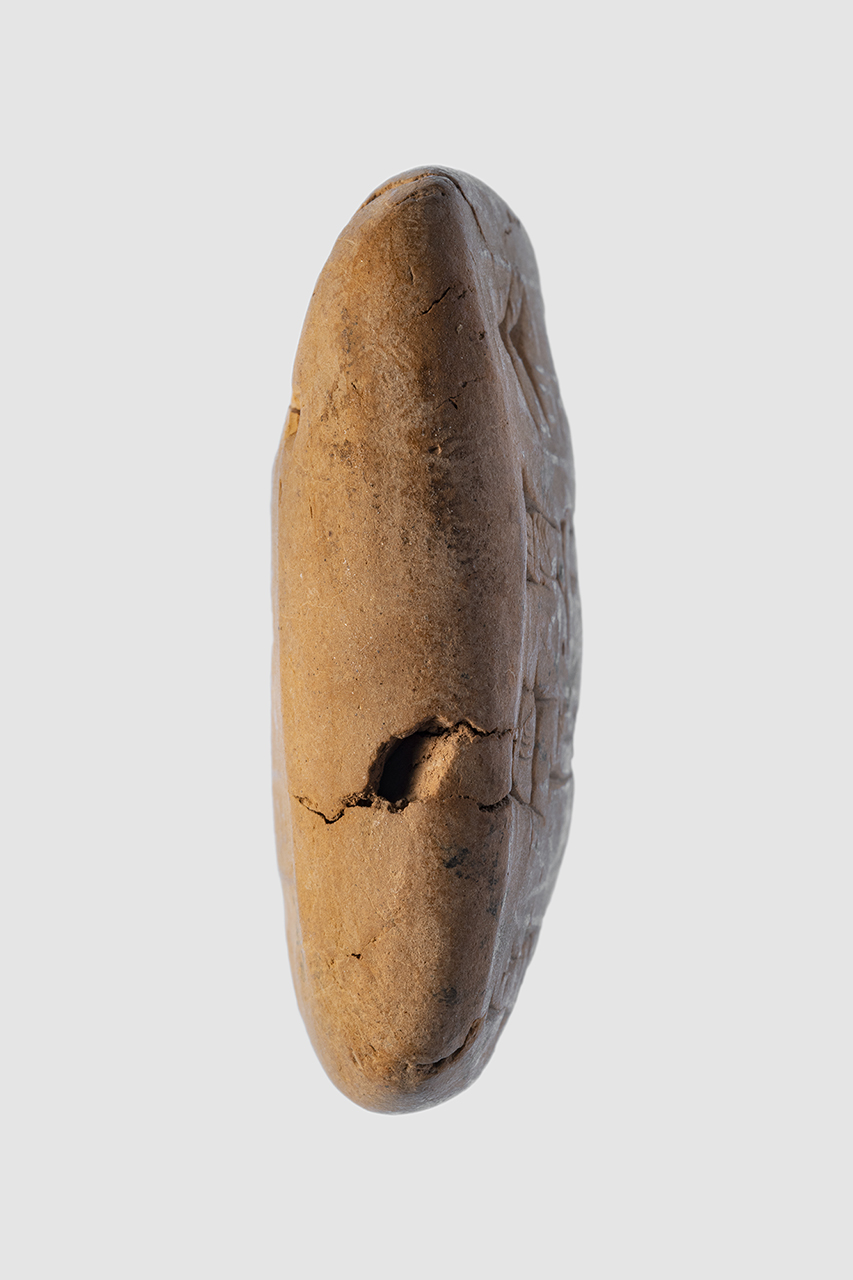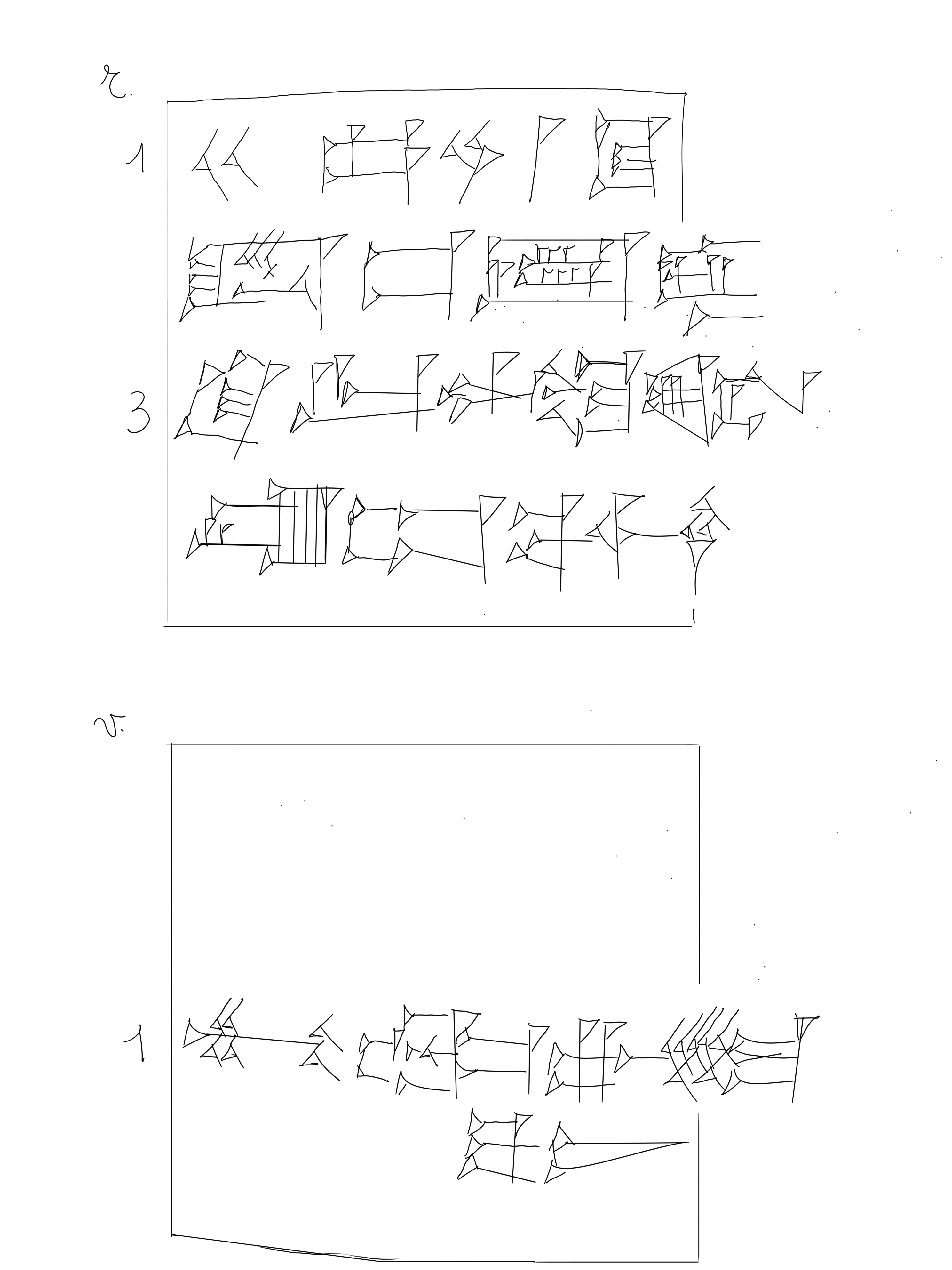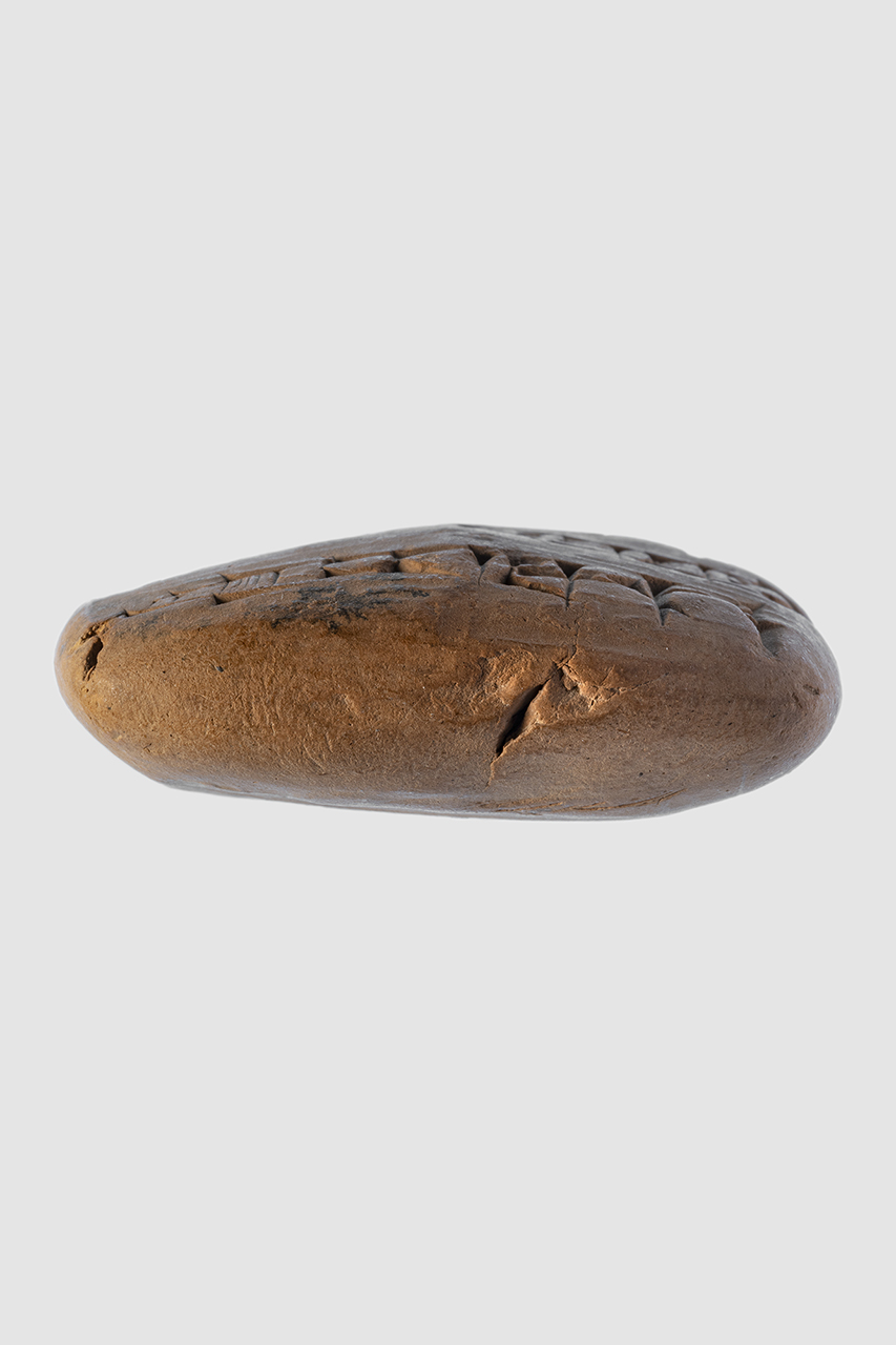 - ISCRIZIONI recto - 1. 20 guruš u4 DIŠ-še3 2. a2 geš-ur3-ra 3. ki ur-dnin-zu-ta 4. kišib3 ab-ba-sig5 Traduzione: 20 lavoratori per un giorno, per lavorare all’erpice. Da parte dell’Ur-Ninsu. Sigillato da Abbasig - cuneiforme - sumerico