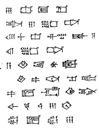 - ISCRIZIONI recto - 1. 6 guruš hun-ga2 2. al 5 šar-ta 3. 10 + 3 1/2 guruš gi-sa7-a 4. 10 + 2 šar-ta Traduzione: 6 lavoratori ingaggiati Per zappare 5 šar (di terreno) ciascuno; 13 lavoratori e 1 a mezza giornata per tagliare Le canne per 12 šar (di terreno) ciascuno - cuneiforme - sumerico