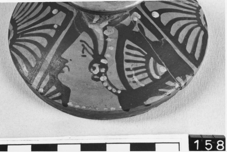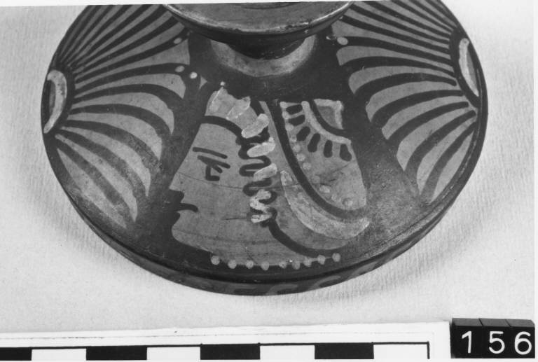 Labbro verticale leggermente rientrante, corpo a profilo convesso, pomello formato da uno stelo cilindrico unito ad un elemento discoidale depresso con piccolo incavo centrale