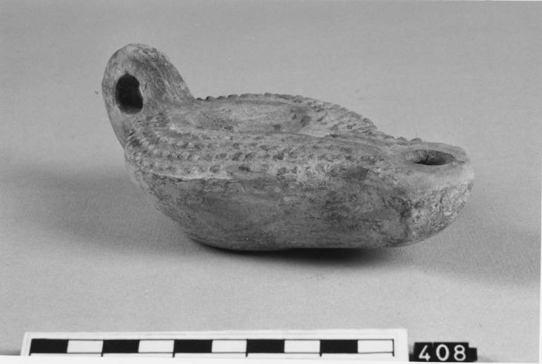 Argilla arancione; tracce di vernice bruna evanida. Corpo biconico con serbatoio allungato, becco arrotondato con volute laterali; canale aperto con piccolo foro di sfiato; disco ribassato; piccolo foro di alimentazione; ansa ad anello verticale con scanalture centrali