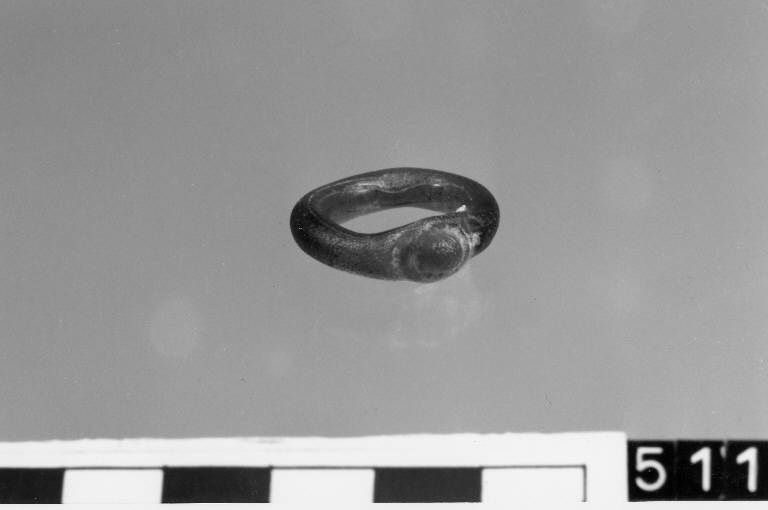 Anello a verga a sezione circolare e castone ad impressione, rotondo a bolla centrale.||Pasta vitrea gialla, con qualche impurità.||