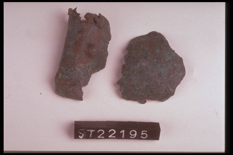 Due borchie di lamina bronzea, di forma circolare, con gancio interno