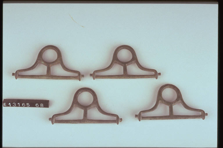 Elemento di bronzo formato da un anello fissato ad una sbarretta da due verghette curve; la sbarretta termina con due perni