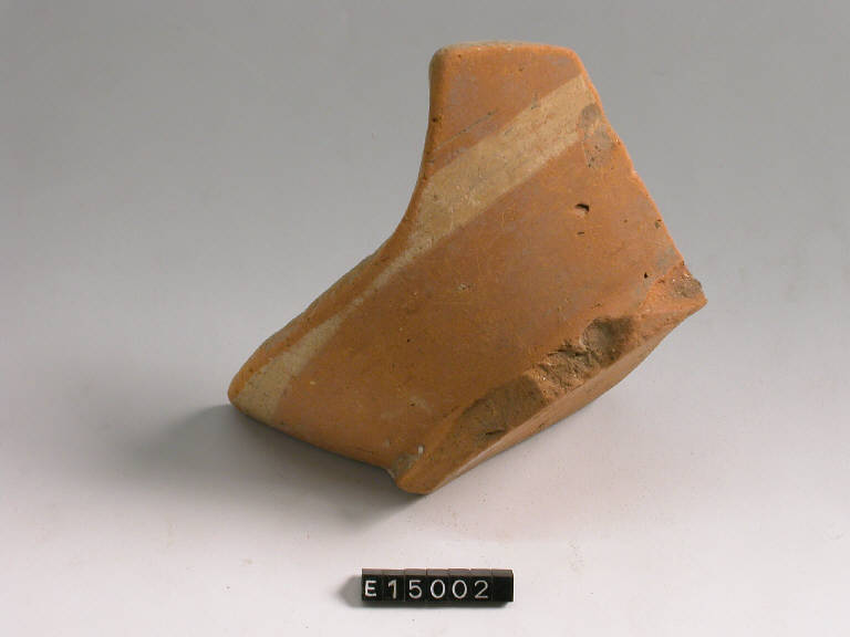 Frammento di fondo piatto e piede ad anello e parete decorata da fasce bianche dipinte, probabilmente pertinente a vaso a trottola