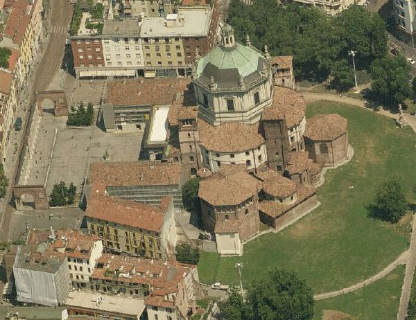 L'edificio di San Lorenzo è caratterizzato da una struttura piuttosto complessa: ai vertici di un corpo centrale quadrangolare (ricostruito dopo il crollo del 1573) si dispongono quattro torri quadrate, collegate a settori di corona circolare (esedre). Ai lati del tetraconco centrale si dispongono sacelli a pianta ottagonale (S. Ippolito, S. Aquilino e S. Sisto). Sul lato occidentale si inseriva la facciata (rifatta nel XIX sec.) preceduta da un vasto atrio quadriportico, il cui prospetto sulla strada era costituito da un colonnato inquadrato da avancorpi in muratura. Oggi l'atrio è scomparso, mentre del monumentale prospetto rimane solo il colonnato. San Lorenzo è la più antica testimonianza conosciuta di chiesa “tetraconca”. Il nucleo più antico della basilica comprendeva il corpo centrale di San Lorenzo e il sacello di Sant’Ippolito, edificati insieme alle torri angolari, mentre la cappella di Sant’Aquilino venne eretta n un momento immediatamente successivo e quella di San Sisto è un’aggiunta del VI sec. d.C. Le quattro esedre a semi-cupola che si affacciano sul corpo centrale presentano colonnati a due piani ed erano collegate tra loro tramite le quattro torri angolari; si aprono al piano terra sul deambulatorio retrostante e al piano superiore sui matronei. Le ricerche di archeologia dell’architettura condotte negli ultimi anni hanno permesso di raggiungere risultati importanti. L'analisi stratigrafica degli alzati eseguita per la prima volta su tutte le superfici esterne della basilica ha stabilito una sequenza della costruzione dei diversi corpi di fabbrica, dei crolli, ricostruzioni e riparazioni. Più di un centinaio di campioni fra carboni e grumi di calce delle malte e frammenti laterizi delle varie fasi sono stati datati con il radiocarbonio e la termoluminescenza e tale lavoro, insieme all’osservazione stratigrafica degli alzati, ha permesso di comprendere la sequenza crono-costruttiva dei diversi corpi di fabbrica e anche di individuare una grande fase di ricostruzione, compresa la cupola, nel X sec., alcuni interventi in età longobarda e carolingia e infine ricostruzioni e riparazioni medievali (XII-XIV sec.). All’interno le pareti dell’edificio paleocristiano erano decorate con opus sectile e la volta era ricoperta da tessere musive dorate. Gli scavi del 1910-1911 effettuati presso il portale marmoreo della cappella di S. Aquilino e nella cappella stessa portarono alla luce, a -2,40 m dal pavimento, la platea di blocchi di pietra di reimpiego sui quali era fondata la cappella; i blocchi provengono dalla demolizione del vicino anfiteatro. Venne effettuato anche un ulteriore saggio fino a raggiungere la quota di -7,55 m dal pavimento della cappella. Ulteriori saggi vennero condotti verso la sacrestia al fine di individuare l'estensione della platea. La platea in questa zona cominciava ad una quota superiore, -0,90 m dal pavimento, ed era alta solo 4,40 m, mentre sotto S. Aquilino era alta almeno un metro in più. Alla fine degli scavi venne rifatto il pavimento mantenendo in vista la platea nel sotterraneo. Il portale, datato al I sec. d.C. e reimpiegato all’ingresso della cappella ottogonale di sant’Aquilino, è costituito da nove lastre di marmo decorate da un rilievo separato da tre fasce di cornici. Sugli stipiti vi sono elaborati motivi vegetali arricchiti da piccole figure isolate (putti, divinità, cornucopie animali vasi) e da scene dionisiache e parodie circensi. L’architrave presenta una fascia a motivi vegetali, una con festoni sorretti da aquile e, nella fascia più alta, un fregio figurato dall’interpretazione non chiara. Sono rappresentate otto divinità legate all’ambiente circense, a cavallo o alla guida di bighe, che partecipano a una gara nel circo, gara in cui si affrontavano quattro squadre ognuna identificata da un colore. Tra le coppie di meta, identificate da due colonnette che chiudono la scena alle estremità e separate da conchiglie decorative contenenti coppie di delfini o uccelli, si riconoscono, a partire da sinistra, quattro divinità maschili, tre divinità femminili e Lucifero, personificazione della stella del mattino e rappresentante dei cavalieri che accompagnavano le corse dei carri. Le divinità maschili sono Mercurio, con caduceo e copricapo alato, in sella ad un animale ibrido, incrocio tra cavallo e capro; il Sole, dispensatore di buona sorte, con corona raggiata; Giove, dio della vittoria, con il fulmine; Marte, con lancia ed elmo crestato. Le dee, a partire da destra dopo Lucifero, sono la Luna, con crescente lunare sul capo; Venere; Vittoria-Nemesi, figura alata con corona e palma della vittoria, ma forse qui sostituita da Saturno, dio della sconfitta. Il valore simbolico della rappresentazione sul portale è legato a credenze astrologiche, era certamente connesso alla funzione del monumento da cui proviene, una struttura pubblica tuttora ignota. La cappella di Sant’Aquilino è costituita da un atrio a forcipe e da un corpo ottogonale, articolato all’interno in un alternarsi di nicchie semicircolari e poligonali. Le quattro pareti dell’atrio a pianta rettangolare, con due absidi alle estremità, erano ornate, al di sopra di una cornice marmorea, da mosaici con le figure dei Patriarchi, degli Apostoli e probabilmente anche dal Cristo, disposte su due piani e identificabili per mezzo di tessere dorate. I mosaici sono riconoscibili solo in alcune parti e sono stati ampiamente restaurati agli inizi del Novecento. Il portale marmoreo introduce all’ottagono centrale, largo 21,20 m e con ogni lato di 8,10 m.; all’interno di ogni lato si apre una nicchia sovrastata da una grande finestra. Si conserva la copertura originaria, un’ampia volta a padiglione alta circa 18 m. Il sacello aveva probabilmente pareti rivestite in opus sectile, di cui restano alcuni frammenti ed era ornato da mosaici. Due nicchie, a est e a ovest, conservano ancora scene leggibili, mentre in una terza vi sono solo alcuni