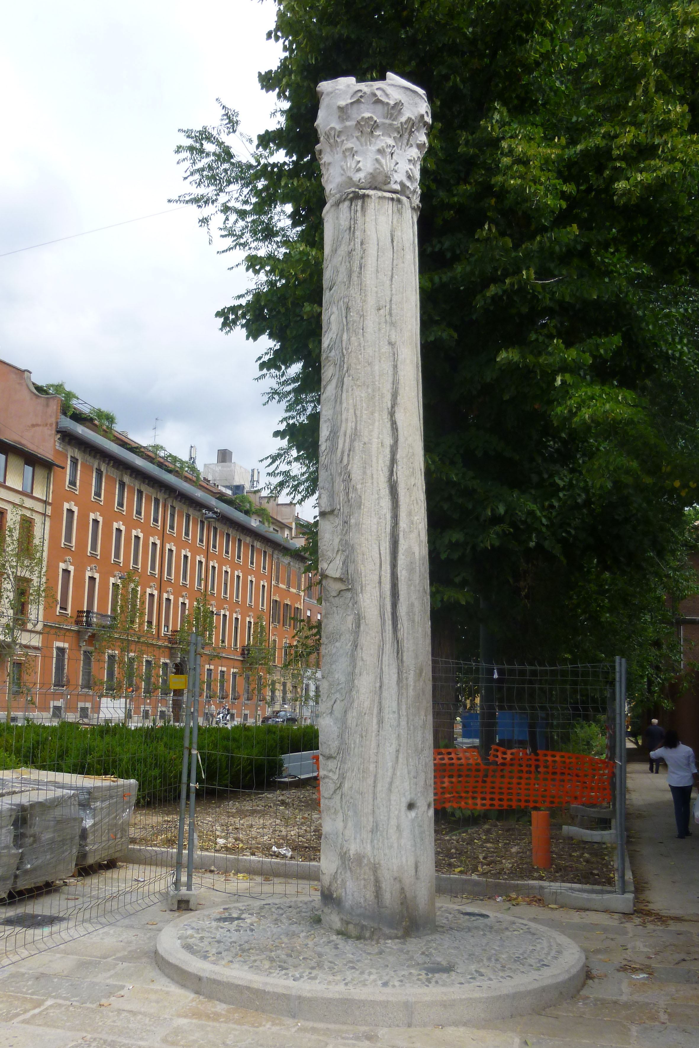 La colonna è a fusto liscio in marmo cipollino bianco con sommoscapo decorato da un collarino costituito da un ovolo e da un listello a profilo diritto. Il capitello corinzio, di tipo asiatico, in marmo non determinato, è alto complessivamente 88 cm. Molto consunto, sono assenti volute e fiori d’abaco. Presenta le foglie del primo ordine, ripartite in cinque lobi, aderenti alla superficie del kalathos con scarso aggetto. Nello spazio libero tra gli apici delle foglie del primo ordine si sviluppano quelle del secondo. Le fogliette centrali dei lobi mediani si univano originariamente a quelle della foglia contigua creando, nei pressi degli apici sottostanti, uno spazio triangolare. Dietro questo si sviluppano brevi cauli a sezione angolare da cui nascono calici molto schematizzati ed elici nastriformi. La spirale delle elici si appoggia alla foglia uscente dai calici. Nello spazio libero tra elici e foglie interne dei calici si eleva lo stelo del fiore d’abaco