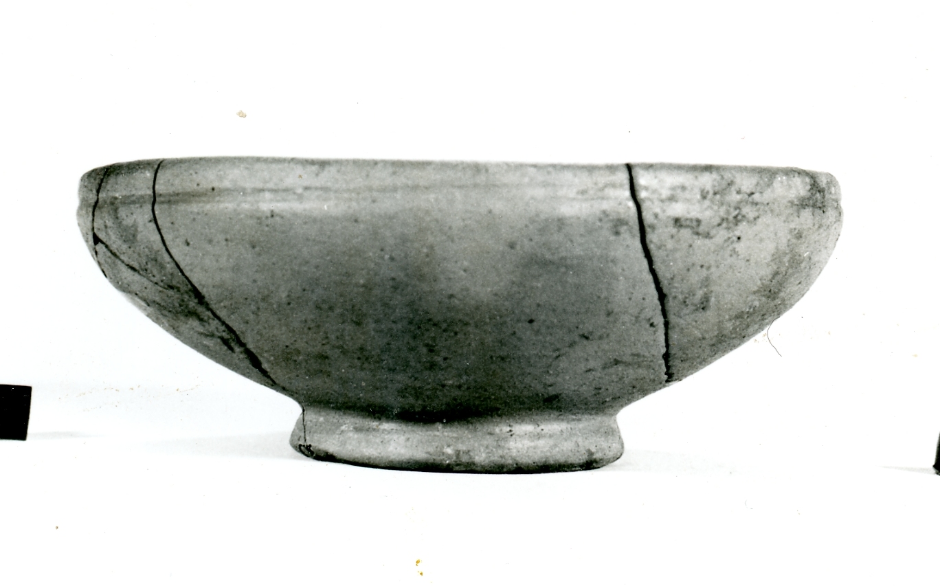 Coppa con ampio piede ad anello obliquo e unghia di posa interna. La parete è spessa e poco convessa; spalla dolce e orlo rientrante con scanalatura esterna