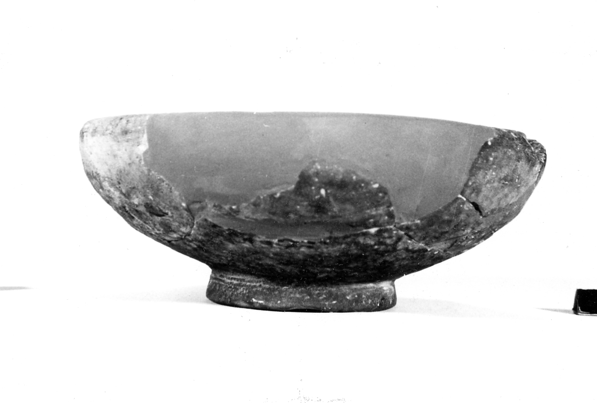 Coppa con ampio piede ad anello obliquo. La parete è convessa e la spalla tonda. L'orlo si presenta liscio e rientrante