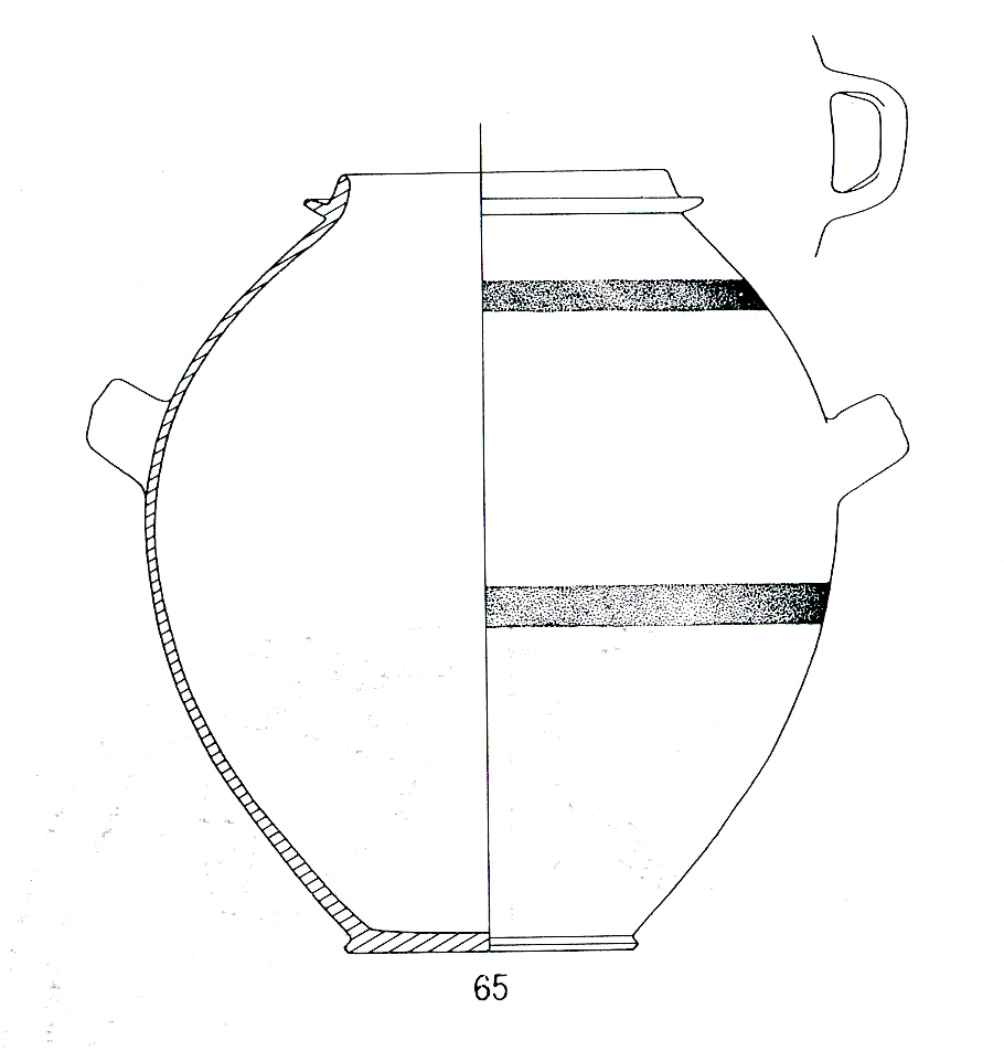 labbro rettilineo, leggermente obliquo verso l'interno, con collarino plastico alla base; corpo ovoide; piede a disco piatto; anse a nastro ingrossato con lieve costolatura mediana, applicate obliquamente sulla spalla; nella parte superiore e poco sotto le anse, tracce di decorazione a fasce orizzontali di ingobbio rosso; corpo ceramico di colore beige-arancio