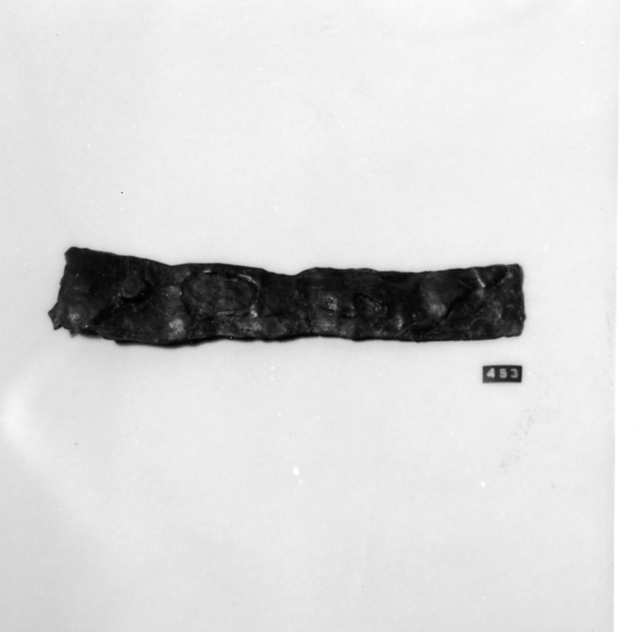 Coltello a dorso diritto con lama a tagliente presumibilmente sinuoso; immanicatura a lingua di presa con chiodo per il fissaggio del manico