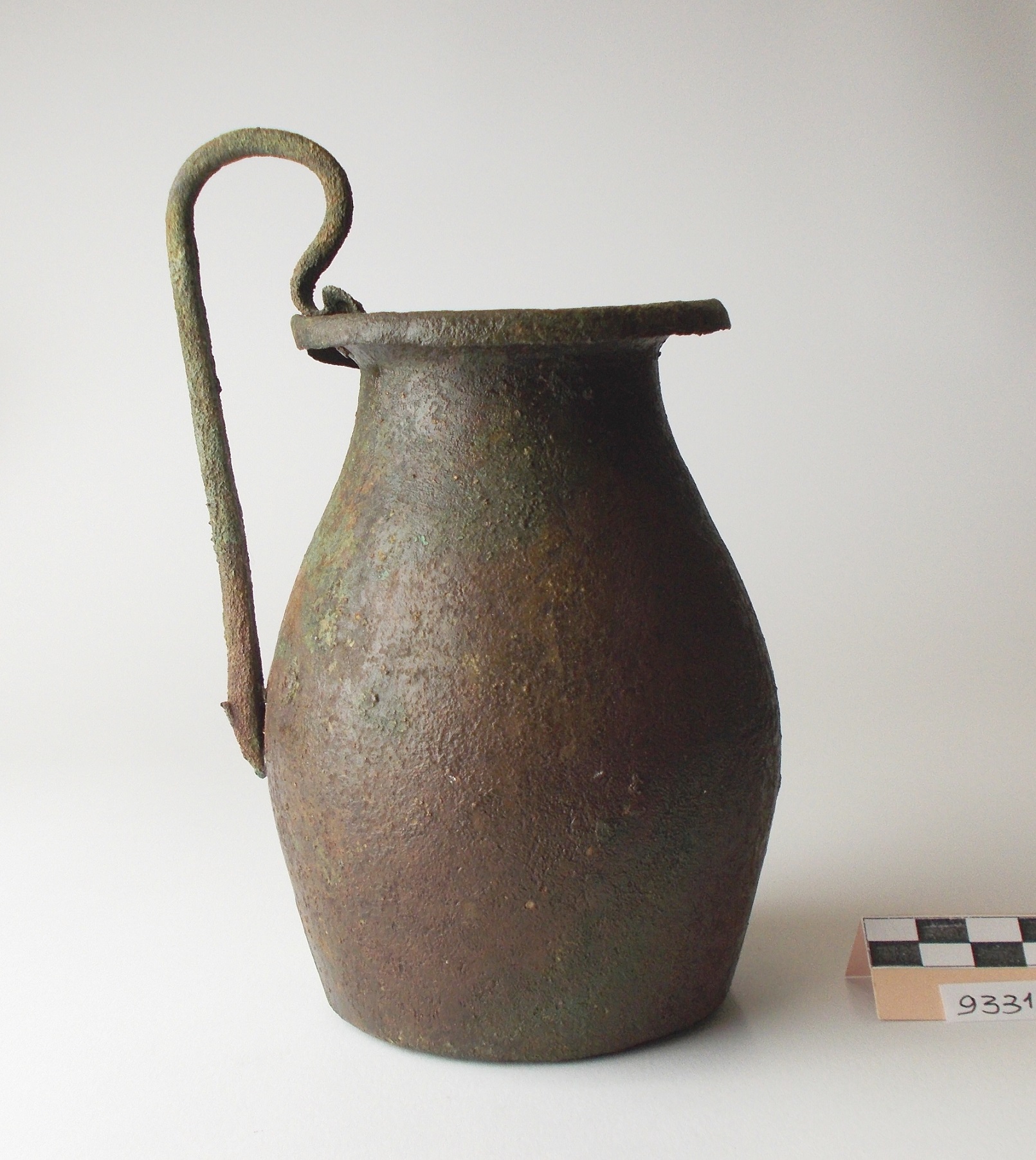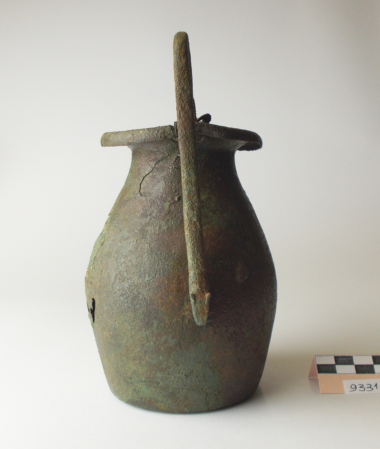 Orlo estroflesso; collo concavo; corpo ovoide; fondo piatto; ansa soprelevata, di verga a sezione rettangolare, con attacco superiore ribattuto a T, e attacco inferiore a protome zoomorfa