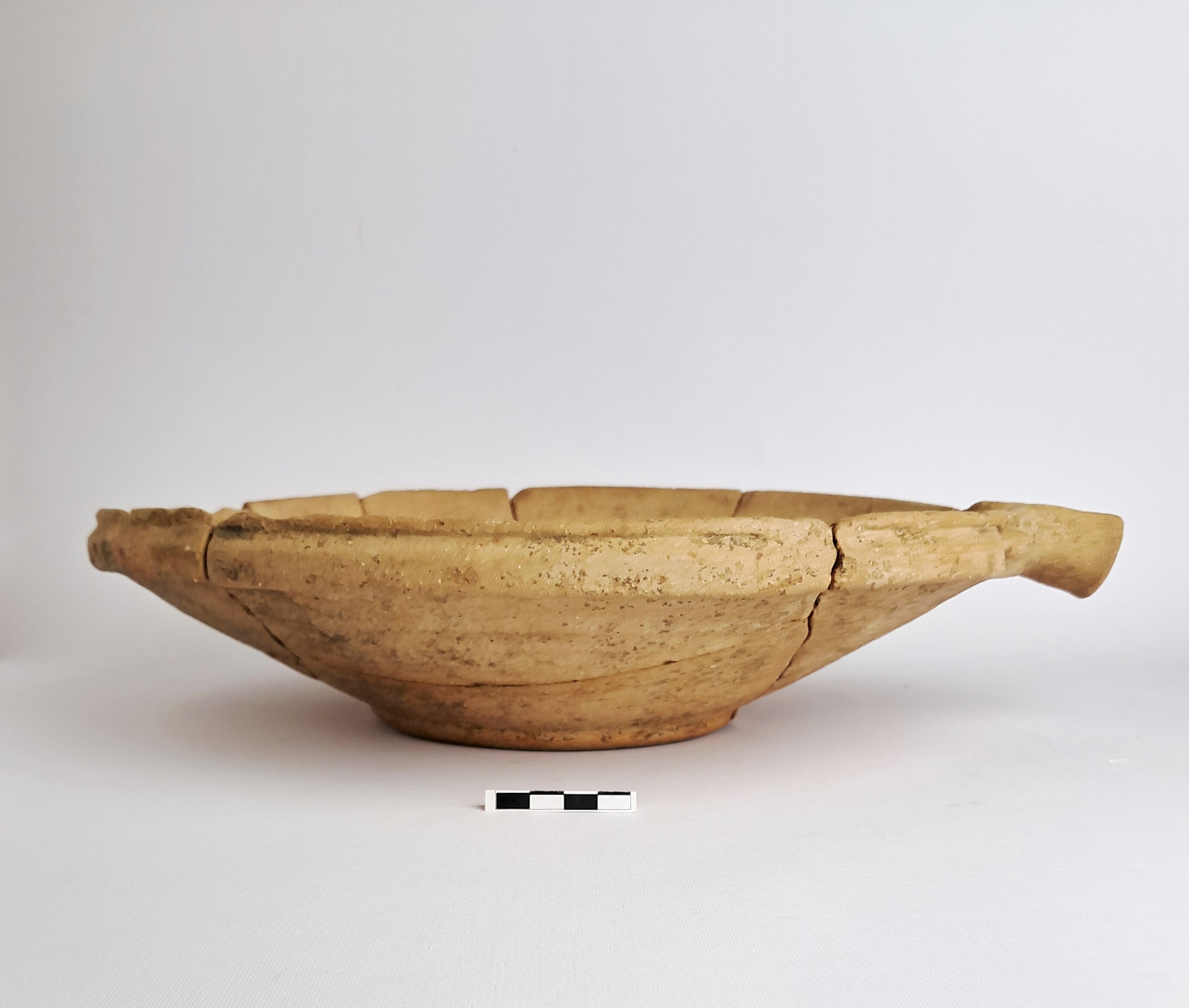 Orlo a fascia verticale, sagomata, con scanalatura orizzontale; ampia e profonda vasca troncoconica; piede a disco piatto; beccuccio a sezione semicircolare con due bugnette laterali, impostato all'orlo. All'interno, sul fondo della vasca, inclusi ferrosi e calcarei costituenti la tipica grattugia. Impasto semi depurato di colore bruno chiaro