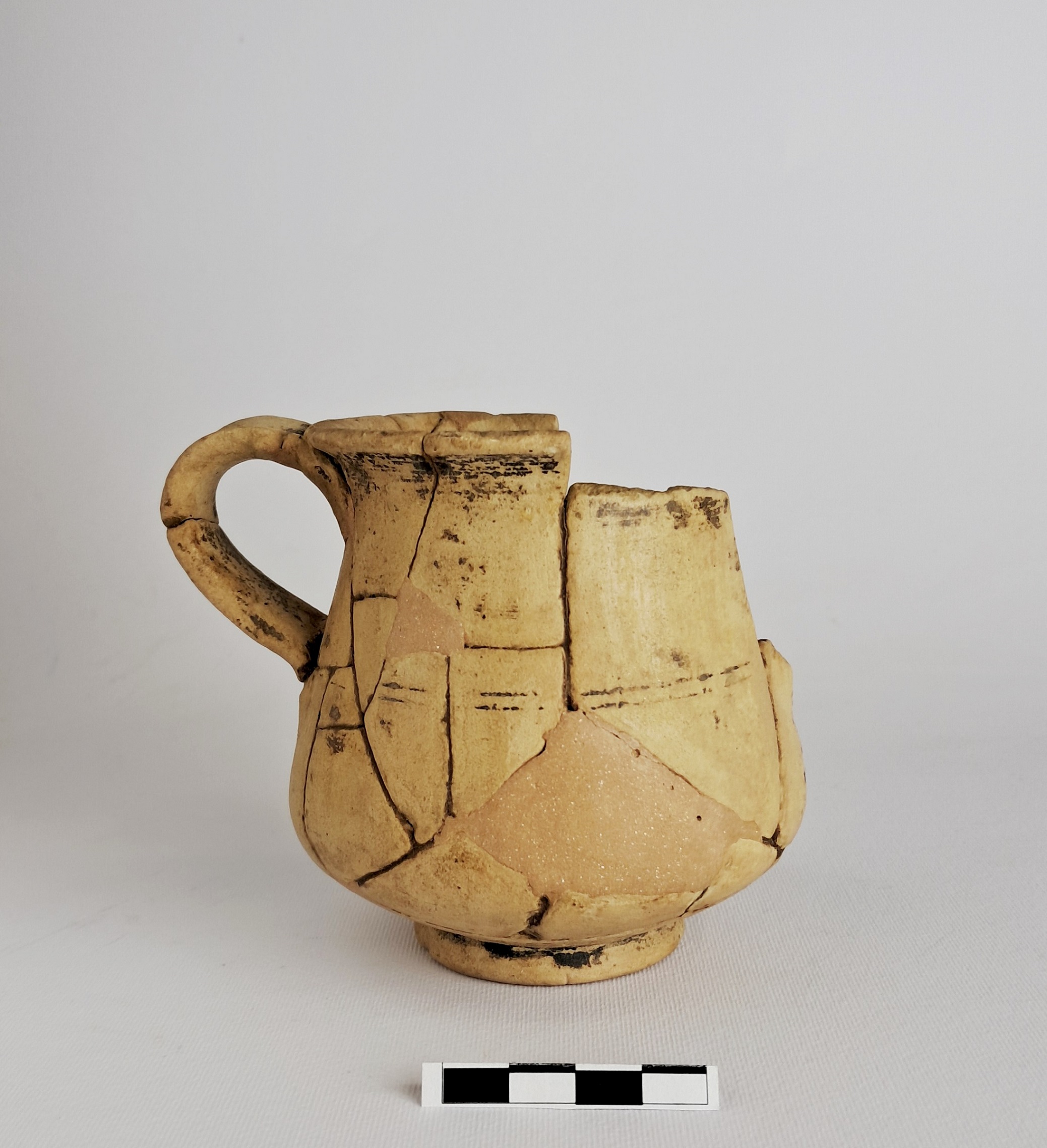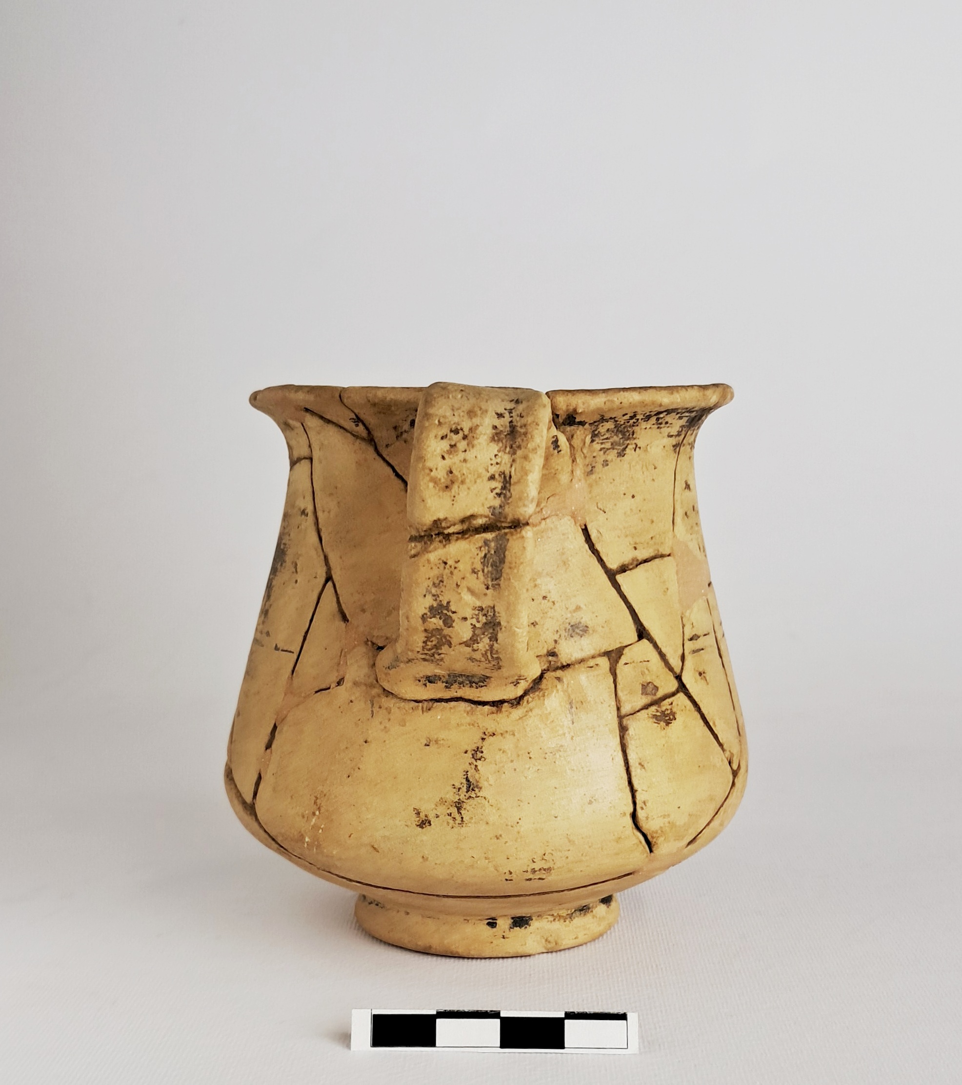 Orlo arrotondato; labbro esoverso; corpo a carena inferiore arrotondata; piede ad anello obliquo; fondo esterno leggermente umbonato; anse a nastro impostate verticalmente tra orlo e ventre. In corrispondenza dell'attacco inferiore delle anse, coppia di sottili scanalature. Vernice nera opaca (tracce)