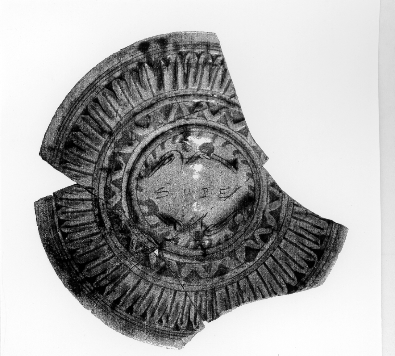 Piede ad anello umbonato, cavo a calotta schiacciata, tesa uscente, labbro arrotondato. Int.: medaglione dentato, motivi vegetali, fascia a nastro triangolare. Colori: giallo ferraccia, verde ramina. Vetrina trasparente