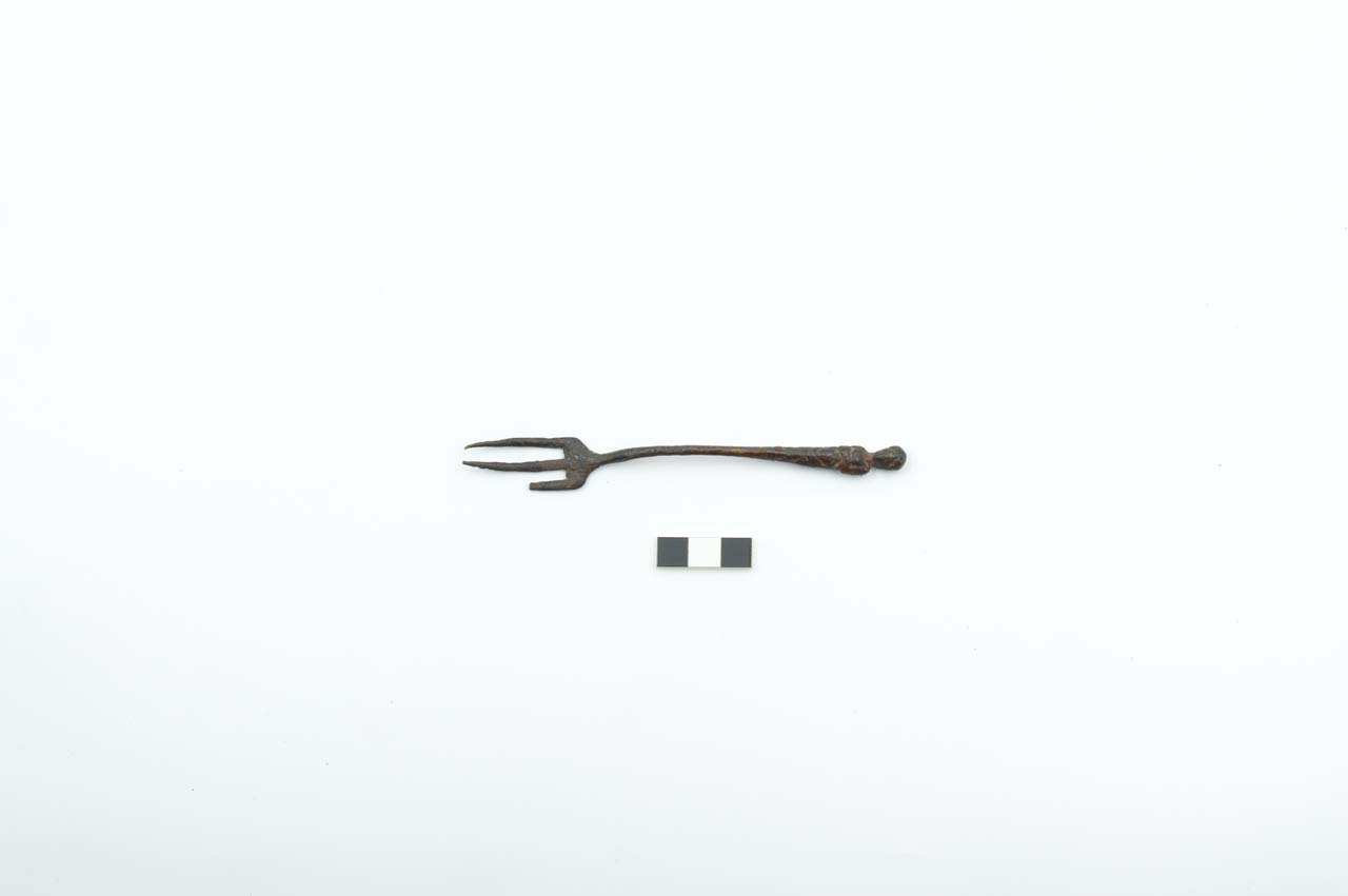 Forchetta a tre rebbi con manico a sezione circolare, con apice decorato con una figuraumana a braccia conserte, appena abbozzata. Un biglietto legato al manico indica "Pola", possibile provenienza del manufatto