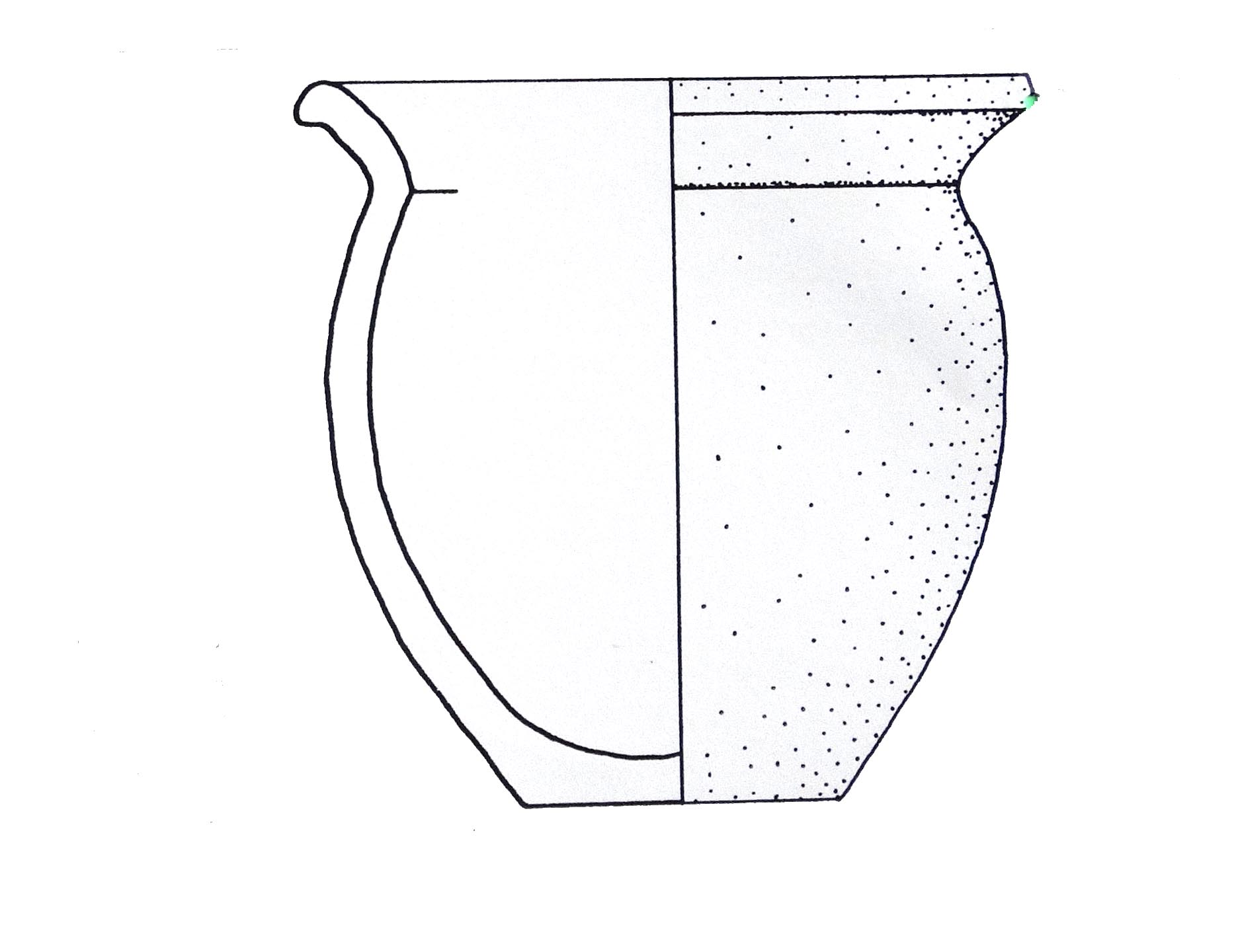 Poculum con orlo ingrossato, labbro estroflesso con profondo sottogola, corpo cilindro ovoide, fondo piano