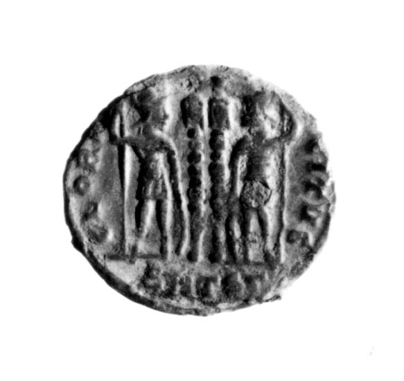R/ Testa laureata a destra di Costanzo II; V/ Due soldati elmati, rivolti l'uno verso l'altro, armati di lancia e scudo; in mezzo due insegne,