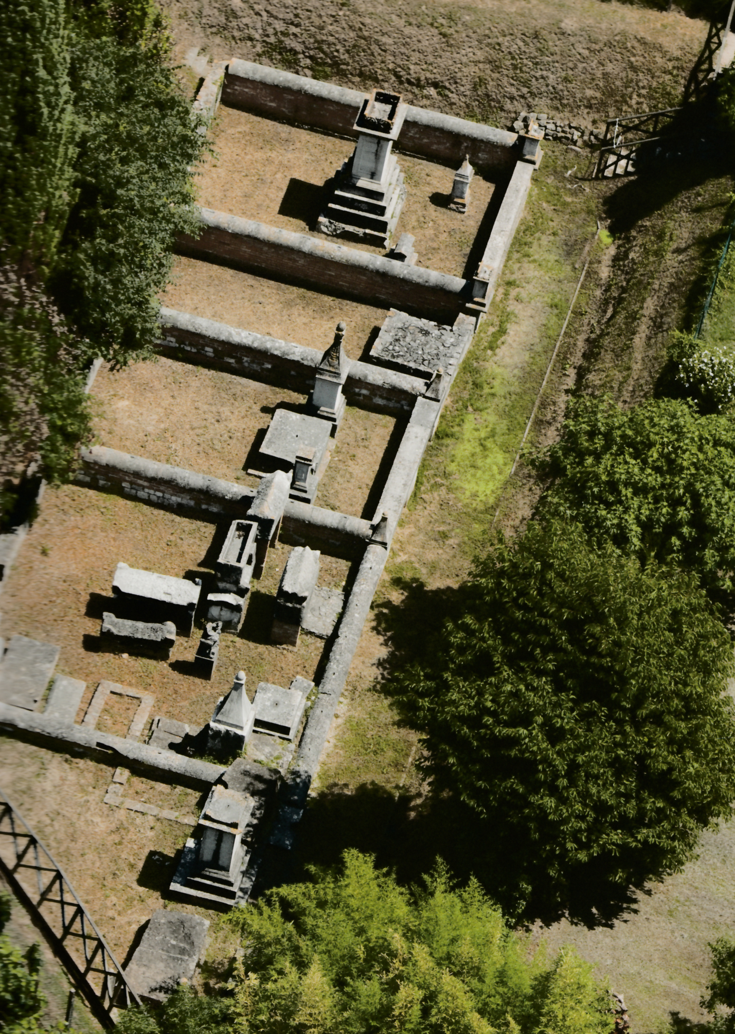 alla profondità di 2,8-3,35 m dal piano di campagna, è emerso un tratto di necropoli costituito da cinque recinti funerari (I-V) delimitati da balaustre più elaborate sul lato frontale e da semplici muretti, sormontati da elementi di protezione in calcare (loriche), sui rimanenti lati. La lunghezza dei recinti è variabile, mentre la larghezza si mantiene costante. Le aree sepolcrali, appartenenti a famiglie dell’antica Aquileia erano originariamente allineate, per un fronte di circa 36 m, su un asse viario diretto a ovest, in uscita dalla città e a breve distanza dalla linea delle mura tardoantiche. Un sollecito intervento di restauro portò alla ricollocazione in situ degli elementi architettonici rinvenuti in posizione di crollo, ad un’integrazione delle parti mancanti di numerosi monumenti e delle balaustre frontali con cemento bianco e, nel caso dei muretti di delimitazione dei recinti, con mattoni appositamente fabbricati per quest’opera (con l’indicazione 1942-XX). Ad un momento successivo risale invece la sistemazione dei sarcofagi del recinto IV, posizionati su pilastrini in mattoni in modo tale da rendere l’idea della quota di ritrovamento. Ulteriori indagini effettuate nel 1988 permisero di scoprire, all’interno dei cinque recinti, altre 15 tombe a incinerazione, con i relativi corredi. La datazione di queste sepolture è fissata tra il I e il II secolo d.C