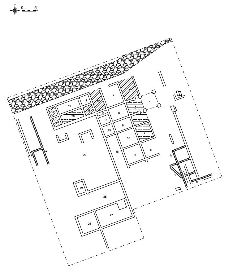 l'abitazione si articola in 27 ambienti che hanno restituito 9 rivestimenti pavimentali (per una descrizione completa e per la bibliografia precedente si veda al sottoparagrafo DO/BIB)