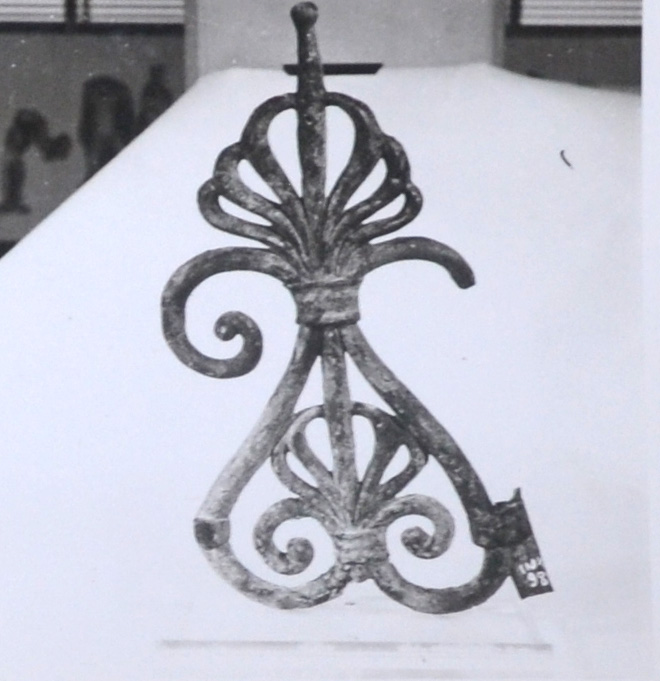 Si tratta di un frammento di sima o di acroterio. Lo schema è abbastanza semplice: le girali di due volute ad S affrontate sono agganciate ad uno stelo sostegno sagomato. Dai due punti di contatto si sviluppano due palmette ad elementi fiammeggianti, l'inferiore a quattro lobi, la superiore a sei. La palmetta, che si può avvicinare a quella di Cividale sempre in bronzo, trova puntuali confronti con ornati e decorazioni fittili