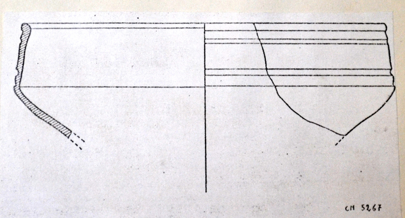 Coppetta a pareti carenate con due scanalature esterne, leggermente restringentesi all’orlo, internamente svasato e sottolineato da una lieve solcatura esterna. Superficie interna ed esterna sabbiata, vernice arancio nocciola chiara. Le coppette a p.s. sabbiate appaiono in età tiberiana, questa tecnica fiorisce nel periodo claudio neroniano e continua meno frequente in età flavia. A Luni sono estremamente diffuse e sembrano appartenere ad una produzione forse locale di buona qualità