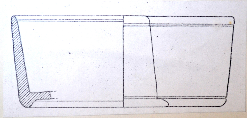 Coppetta a pareti rettilinee, basso piede ad anello. Duplice scanalatura all’esterno, poco sotto il bordo e vicino al fondo; scanalatura interna all’orlo