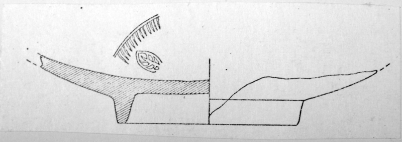 fr. di piede ad anello di patera; all'interno sul fondo decorazione a palmetta entro cerchio di trattini incisi a rotella. Questo tipo di decorazione si riscontra solitamente sulla forma Lamb. A 36, il colore dell'argilla potrebbe essere motivato da ecceso di cottura