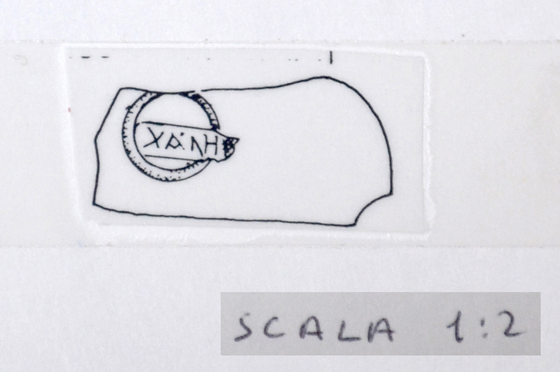 piccolo fr. di fondo, di tipo non determinabile. all'interno, entro un cerchio, è impressa la marca in planta pedis destra. Le lettere NTHI appaiono legate