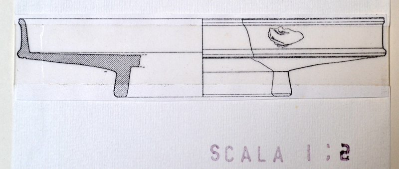 piatto framm. tipo Goud. 39, riferibile alla variante c per il profilo rettilineo del bordo. Modanatura al labbro e all'attacco del fondo. E' decorato ad applicazioni, il cui motivo è illeggibile perchè troppo abraso