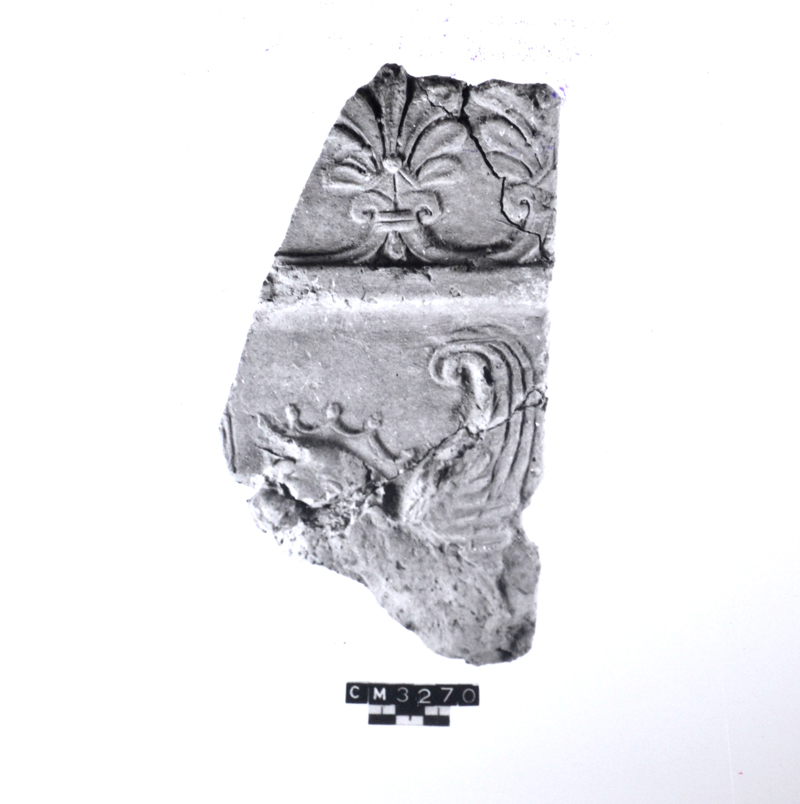 frammento di lastra campana con coronamento a palmette legate da volute. Listello liscio. Entro le specchiature parte superiore di figura di grifo