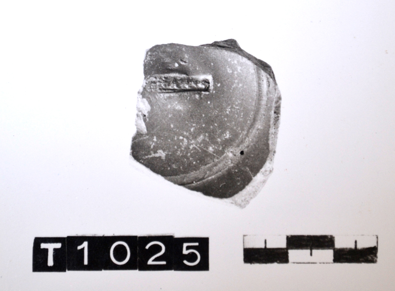 Frammento di fondo e di parete modanata di coppetta; sulla superficie interna solcatura circolare e bollo in riquadro rettangolare impresso imperfettamente