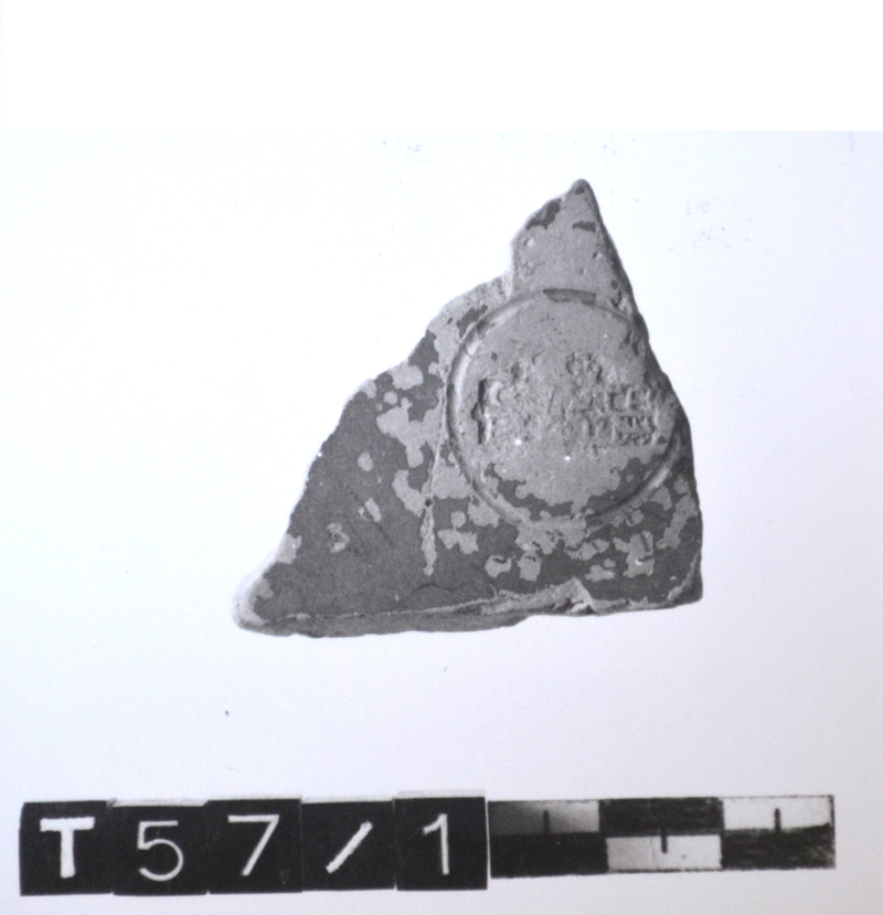 Frammento di fondo di forma aperta; sulla superficie interna solcatura circolare e bollo in riquadro, su due righe