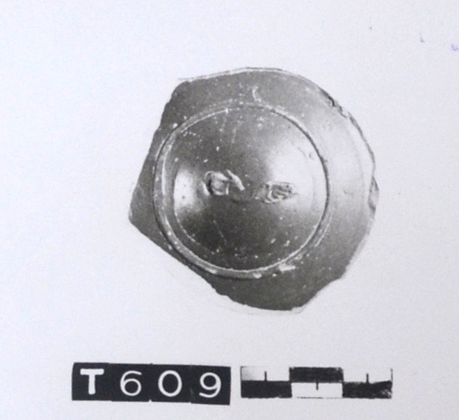 Frammento di fondo di coppetta, sulla superficie interna cerchio rilevato e bollo illeggibile in planta pedis; sulla superficie esterna graffito
