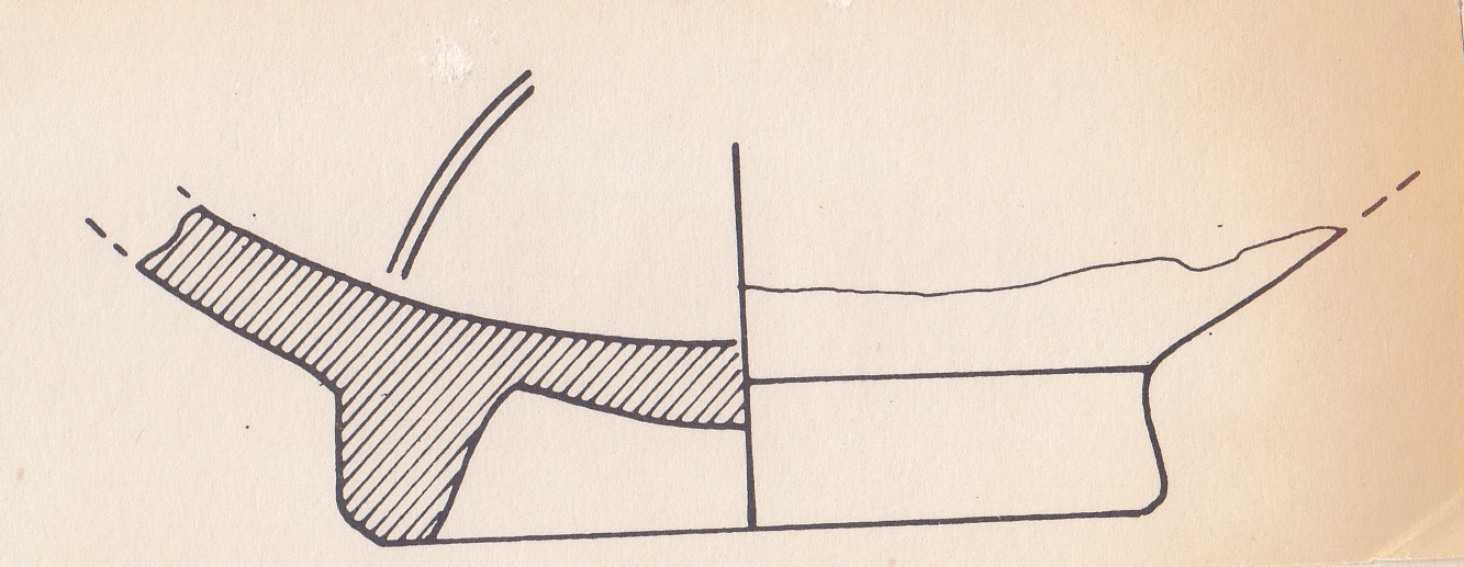 Frammento di piede appena svasato, con spigolo smussato e base ad anello. Sulla superficie interna della coppa, cerchio inciso. Ceramica "campana" A. Argilla depurata, leggermente farinosa, rosata; vernice nera