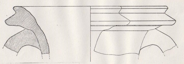 Collo frammentario troncoconico con orlo basso, ingrossato e caratterizzato da due accentuate espansioni; anse a nastro impostate immediatamente al di sotto dell'orlo; il frammento sembra riferibile alla forma Vindonissa 581. Argilla biancastra, porosa, con molte impurità brune, lavorata al tornio