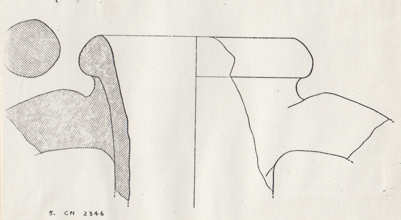 Collo frammentario cilindrico con orlo ingrossato e arrotondato, grosse anse a sezione circolare impostate sotto l'orlo; il frammento è riferibile ad un'anfora del tipo Dressel 20. Argilla rosa nocciola con ingubbiatura chiara, lavorata al tornio