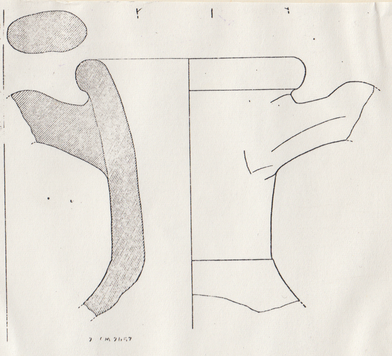 Collo frammentario a tronco di cono rovesciato con orlo ingrossato e arrotondato, stacco netto tra collo e spalla, ansa (pseudobifida) leggermente rimontante con gomito arrotondato all'esterno; il frammento è riferibile ad un'anfora del tipo Dressel 2-5 probabilmente di imitazione. Argilla rosata tenera lavorata al tornio