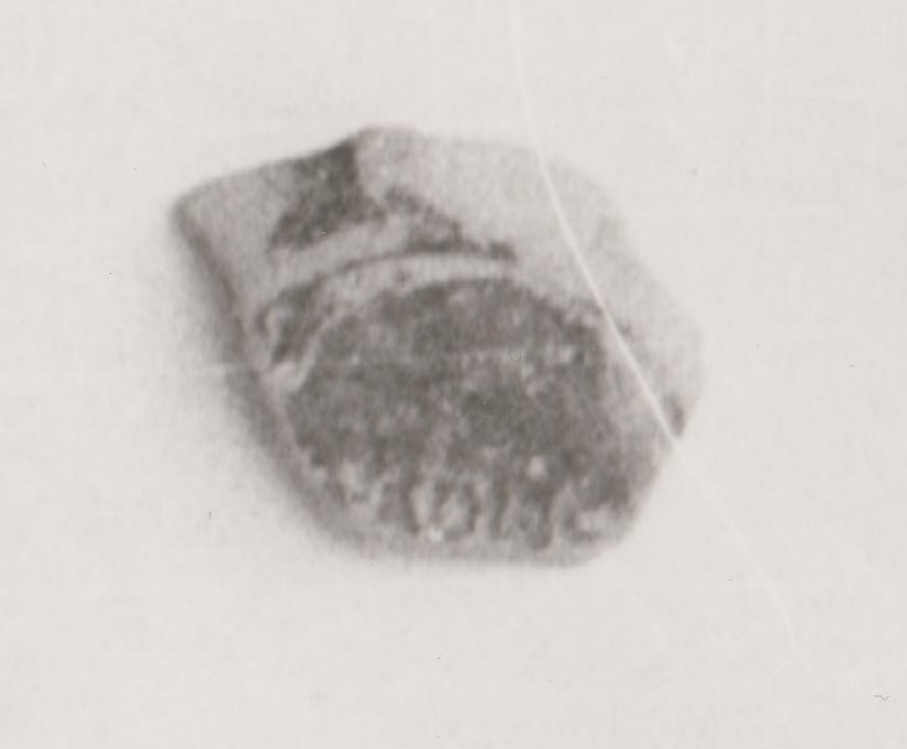 Fondo di lucerna. Conserva la marca: L.MU(natius) ADIEC(tus). Cfr. CIL XV, 6560. Argilla depurata di colore beige, chiara, farinosa. Vernice marrone