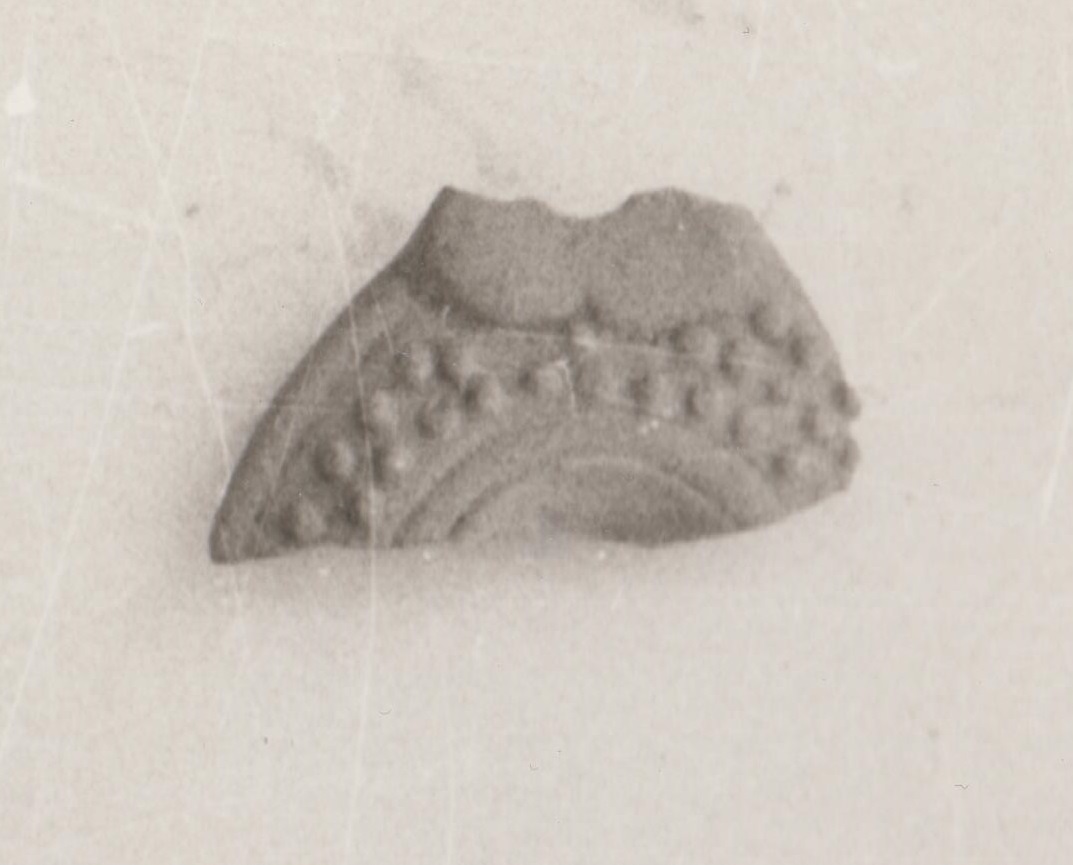Parte del corpo e del beccuccio di una lucerna a granulazione rilevata. Il beccuccio è corto e rotondo, a forma di cuore. Il disco è marginato da cerchi concentrici. Argilla di colore rossiccio, dura, a frattura netta. Vernice verdastra