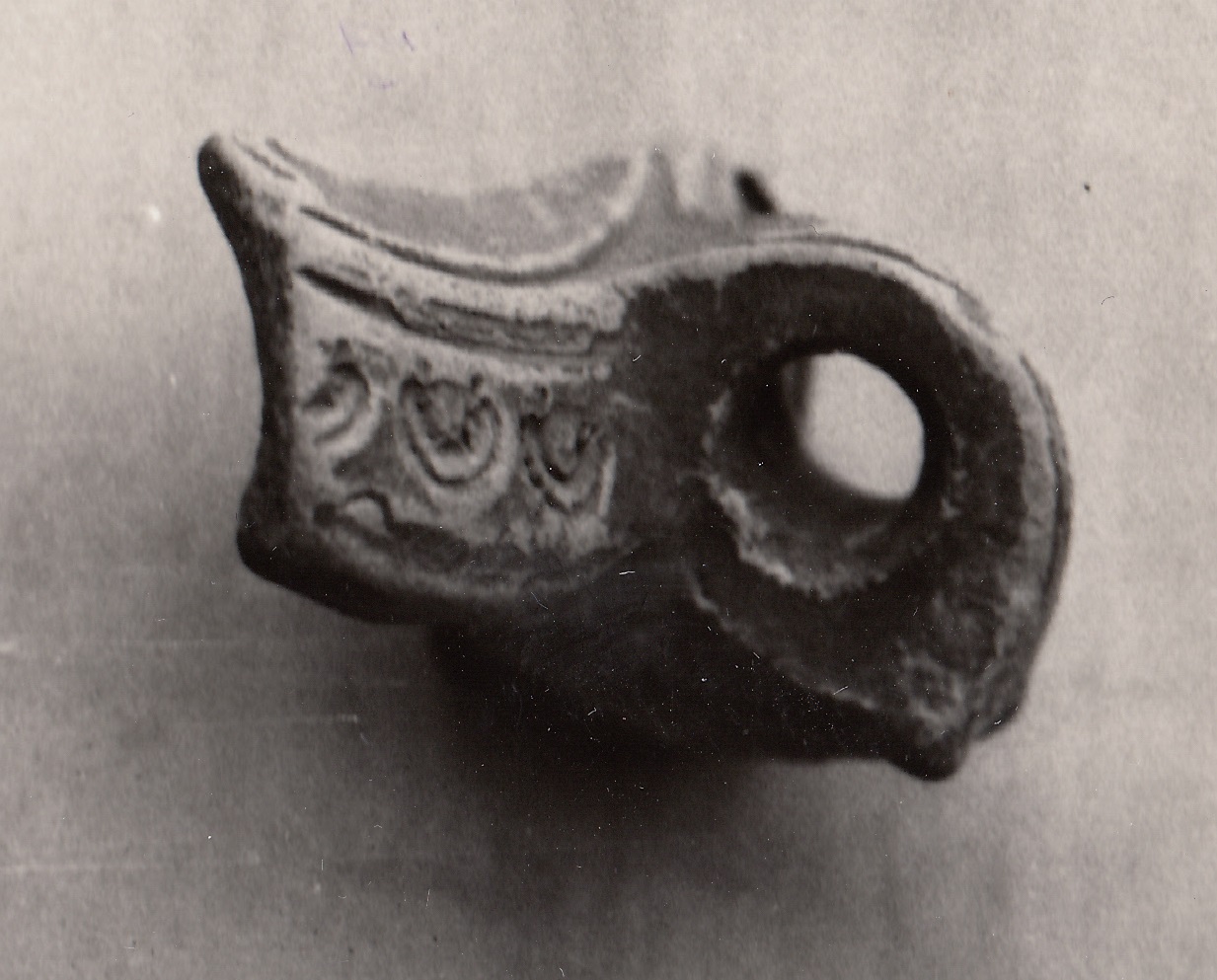 Lucerna a becco corto e rotondo con spalla decorata da ovuli. Deneauve, tipo VII. Argilla beige, tenera, farinosa, con vernice rossastra