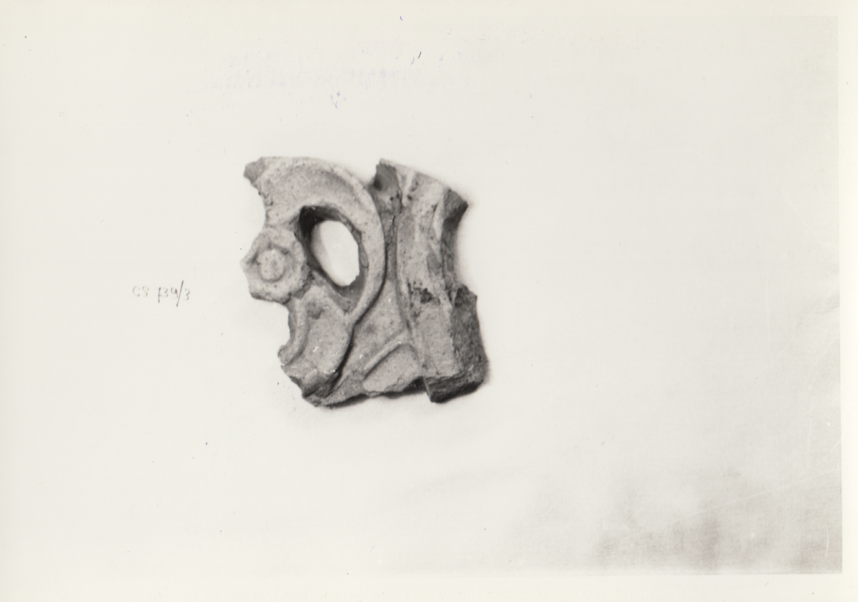 Parte di cornice traforata di coronamento frontale. L'esemplare completo si presenta come segue: dall'alto serie di palmette a sette petali, treccia con fori, nel mezzo girandole alternate con intrecci ad otto, traforati. Argilla di colore rosato con grossi inclusi, porosa, a frattura irregolare. Esecuzione a stampo