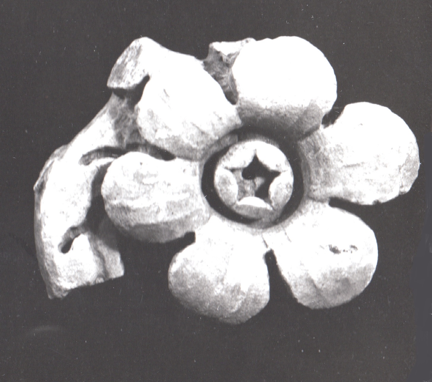 Rosetta con stelo, appartenente alla voluta di un capitello corinzio, a sei petali e boccio centrale aperto